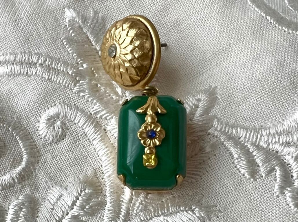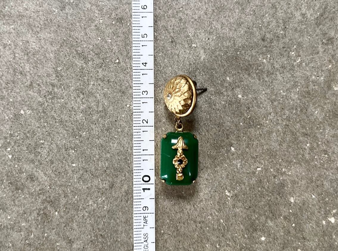ミリアムハスケルのドームをカボションに、ネイビーとイエローのスワロフスキーを置いたグリーンのオクタゴンパーツを繋ぎました。
