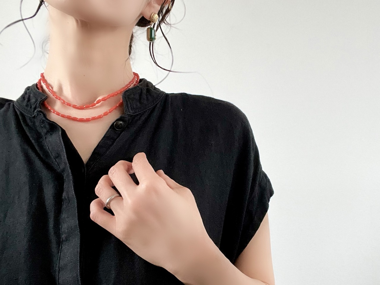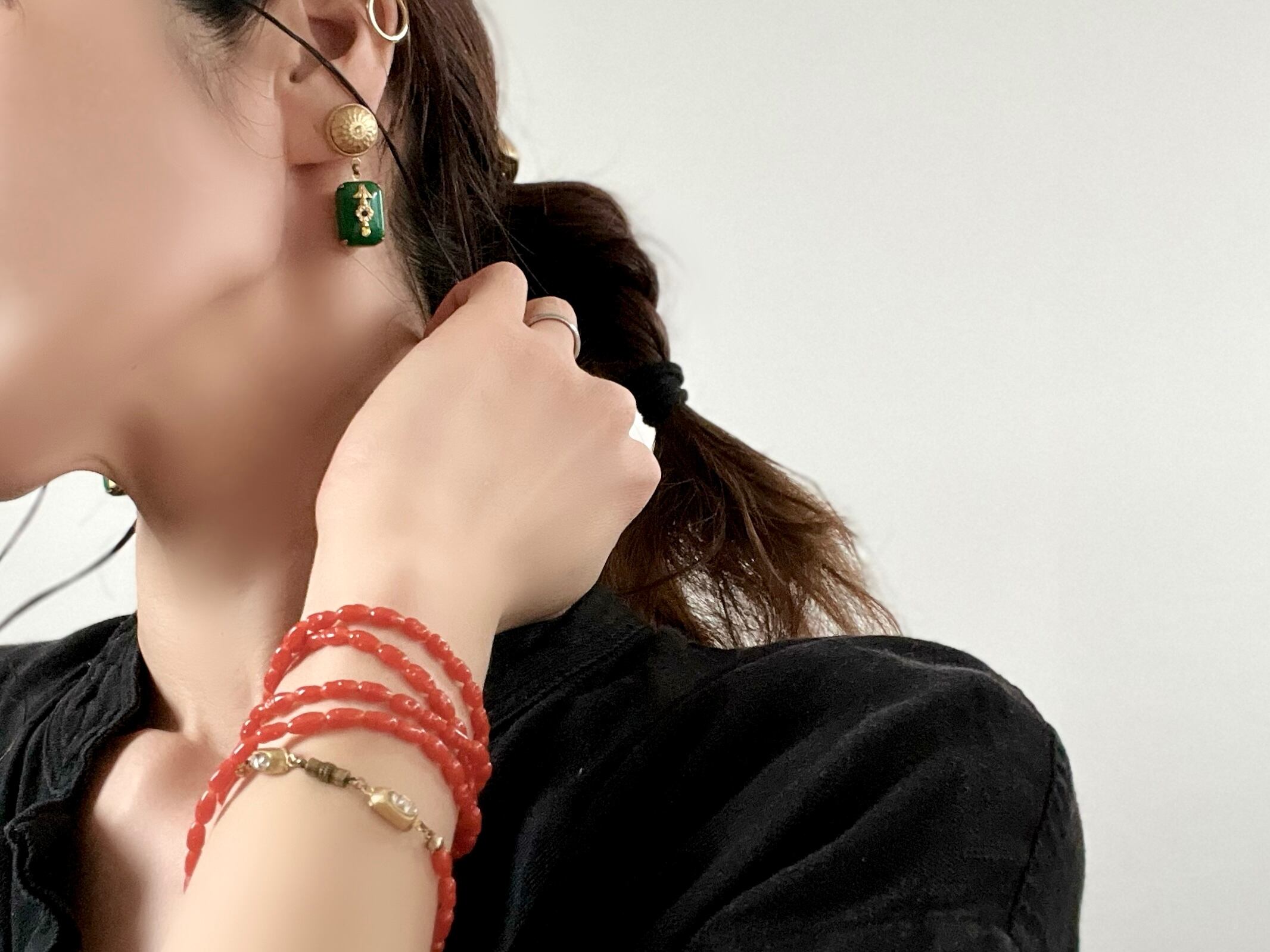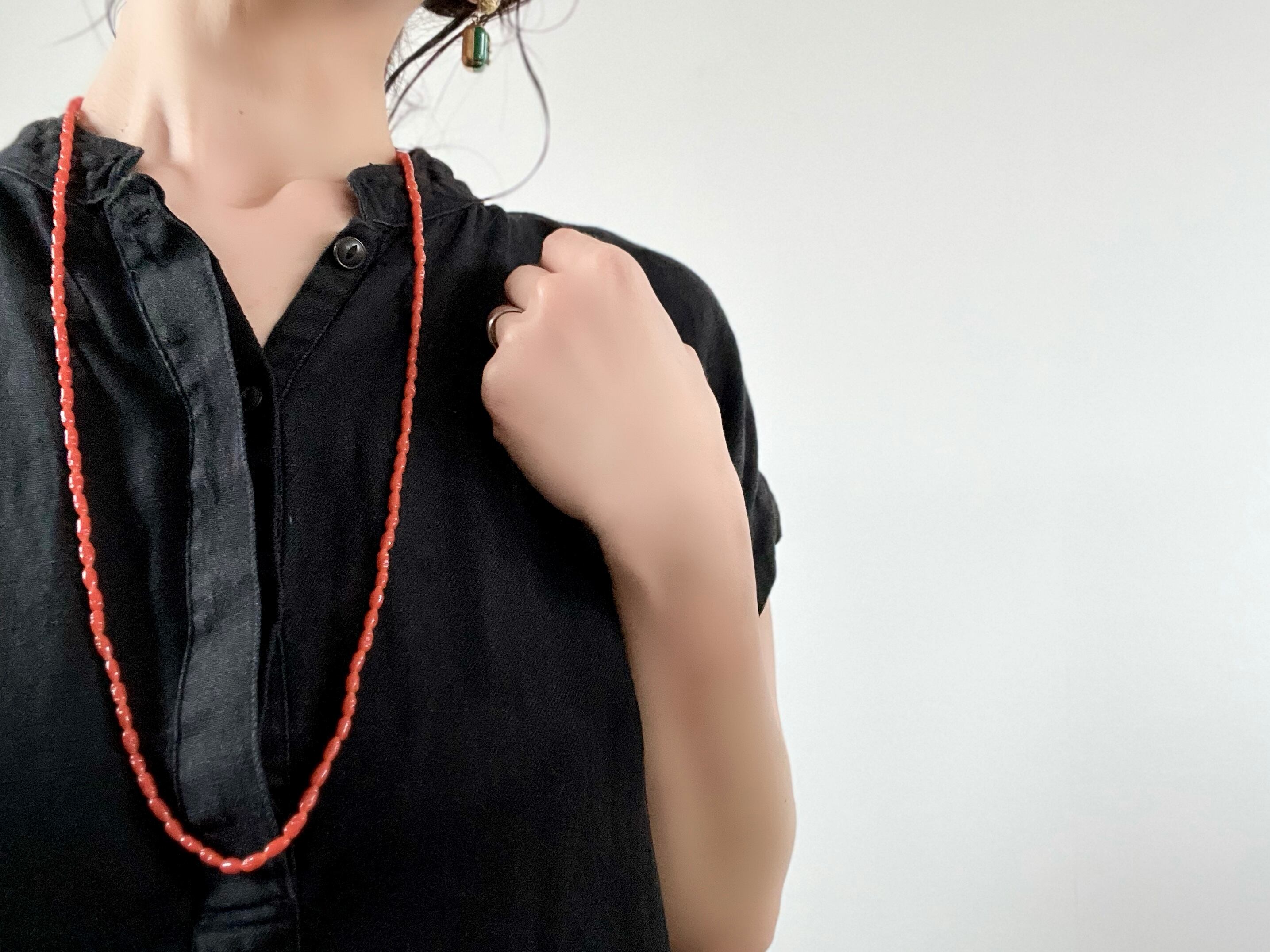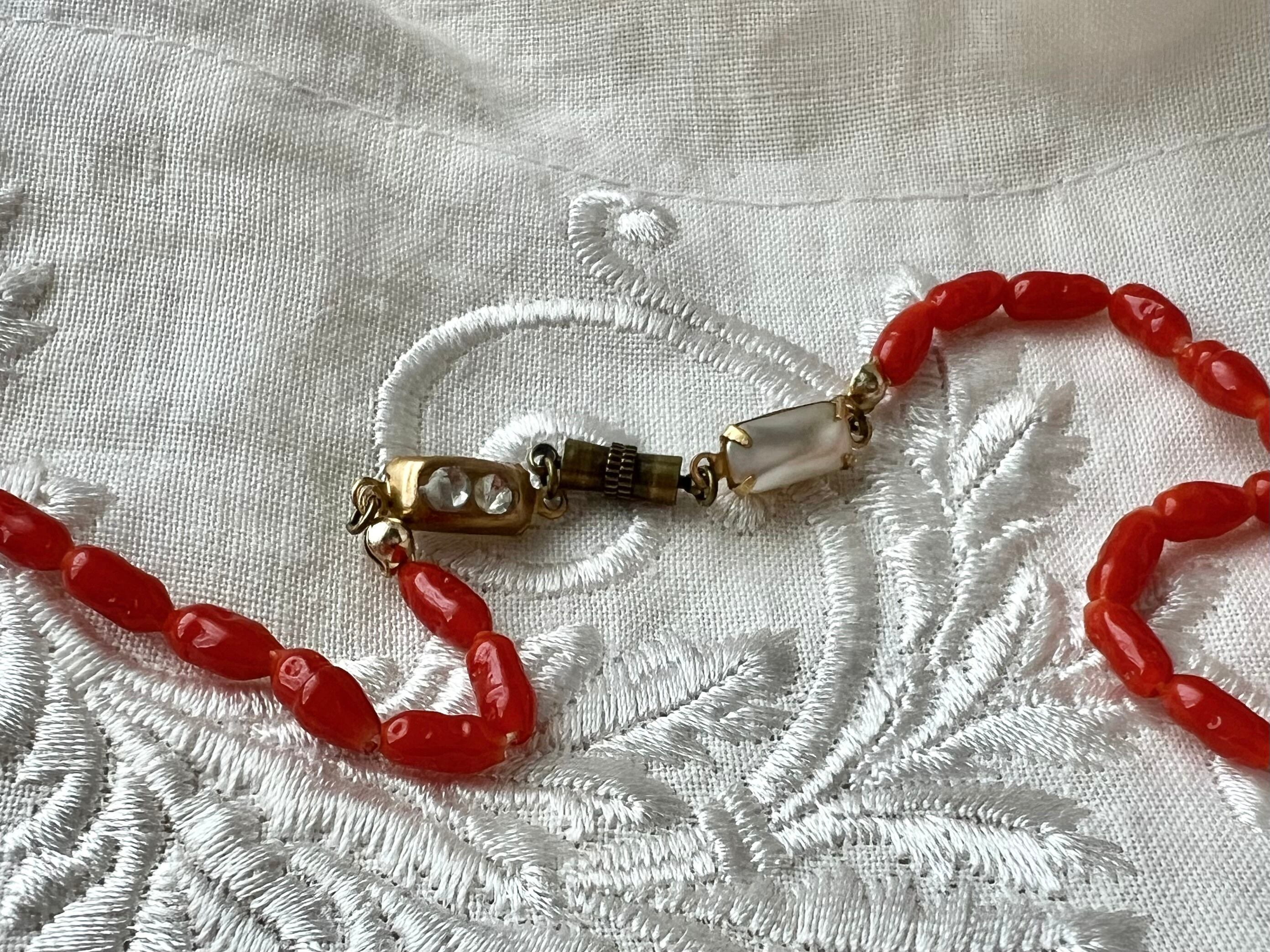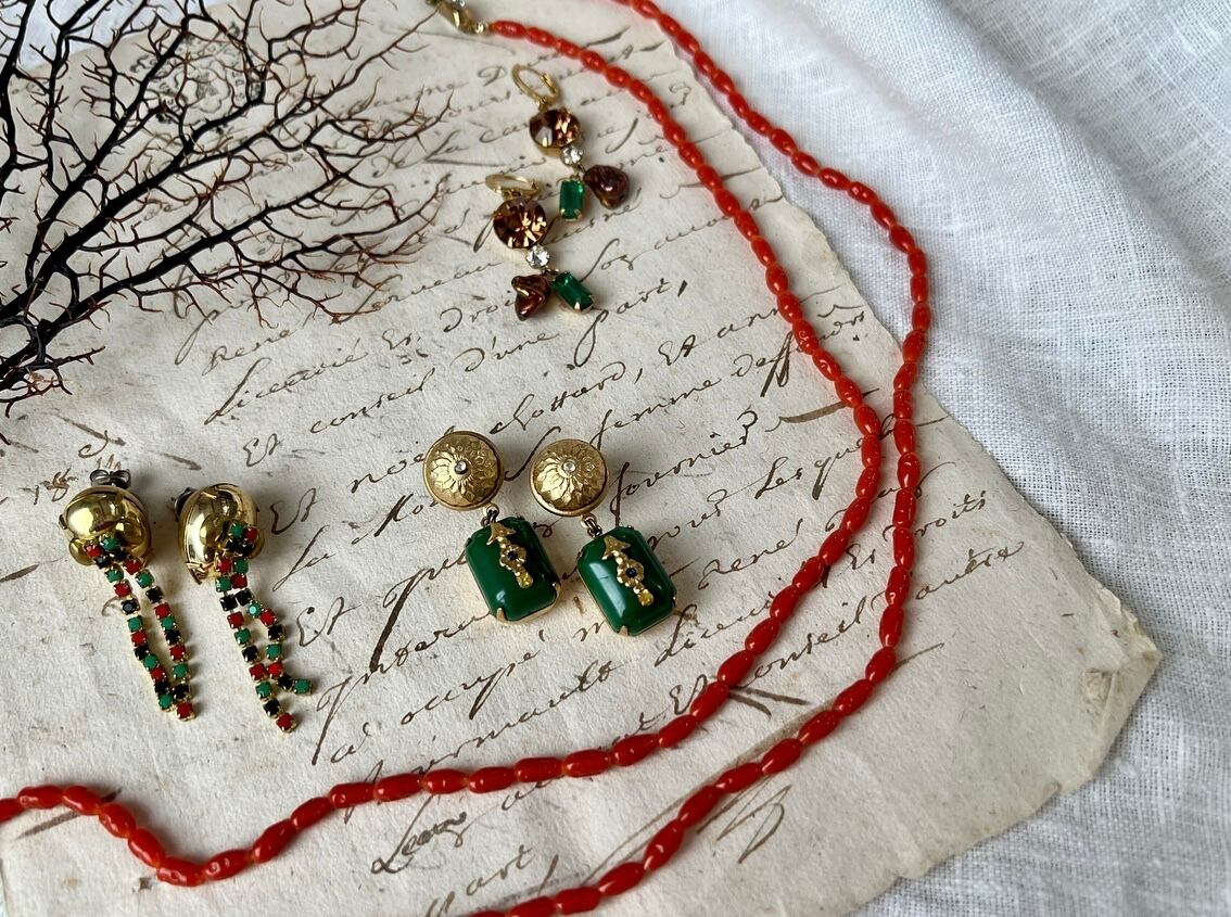 ヴィンテージらしい雰囲気のあるコーラルカラーのガラスが肌をパッと明るくしてくれ、装いの良いアクセントになる一品です。