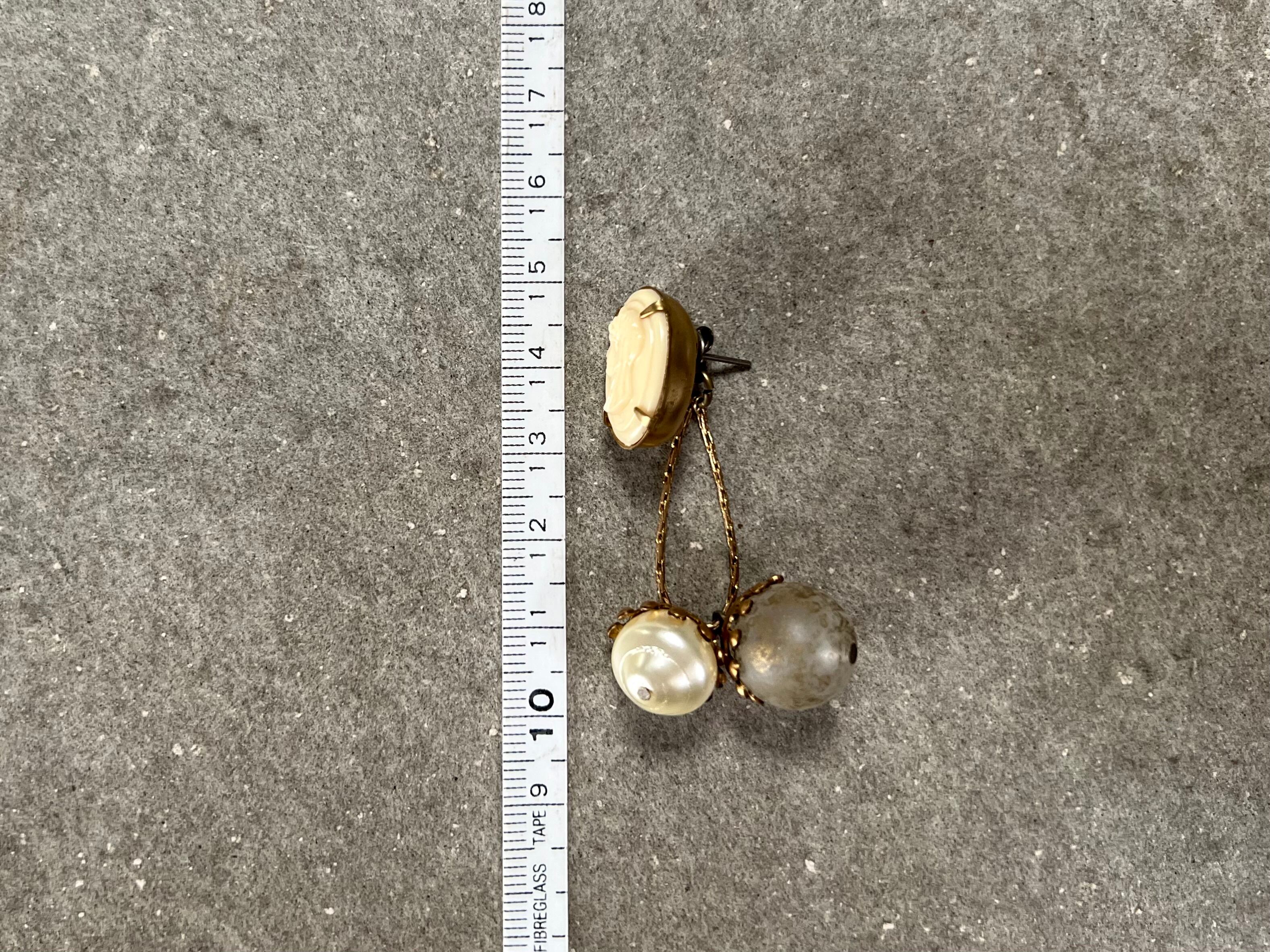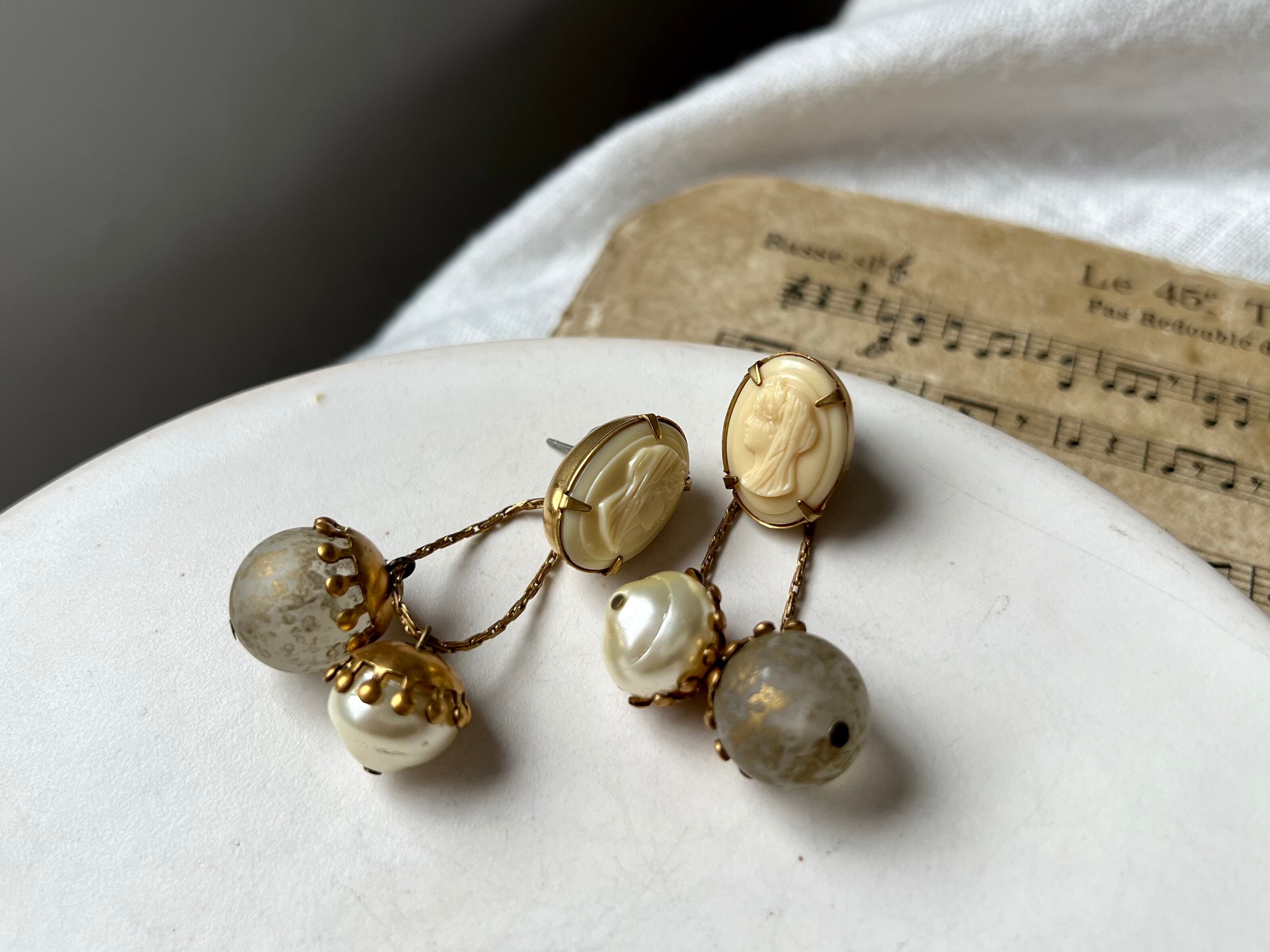 アイボリーカラーのカメオをカボションに、ミリアムハスケルのキャップを載せたガラスパールやゴールドペイントが入ったマットクリアのボールをチェーンで繋いでいます。