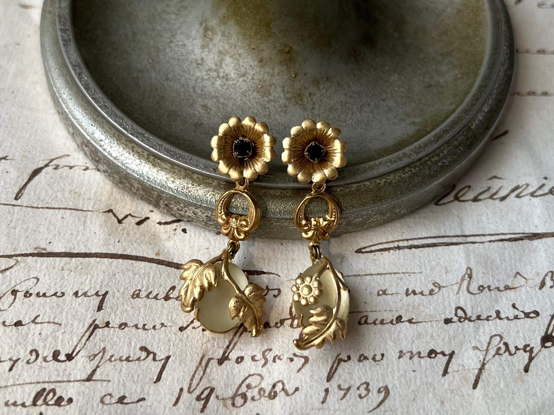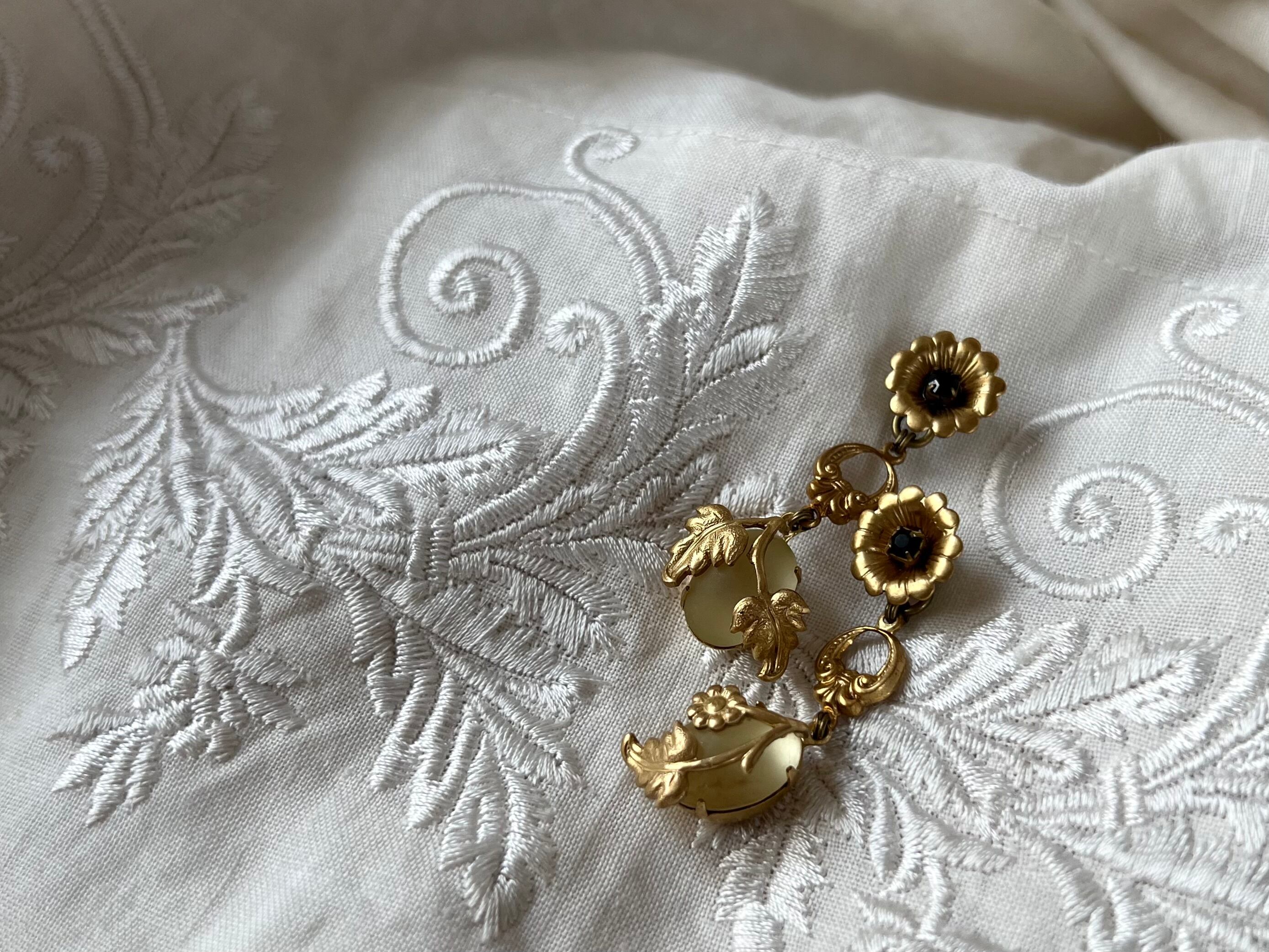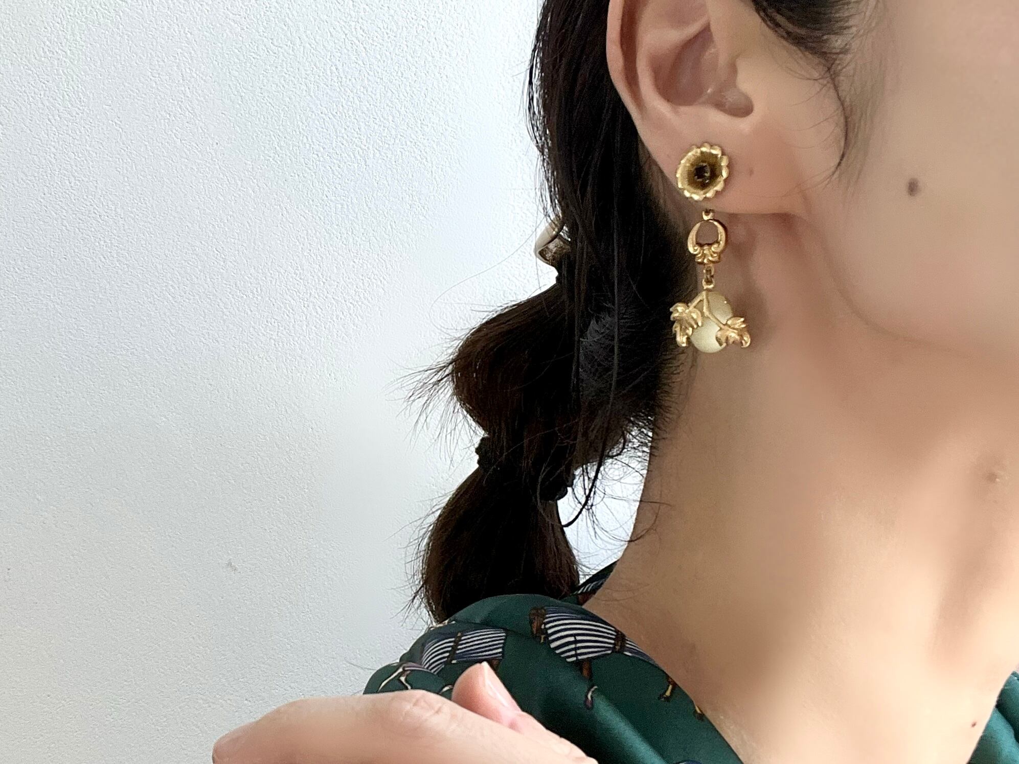ヴィンテージパーツを使用してアシンメトリーなピアスを作りました。