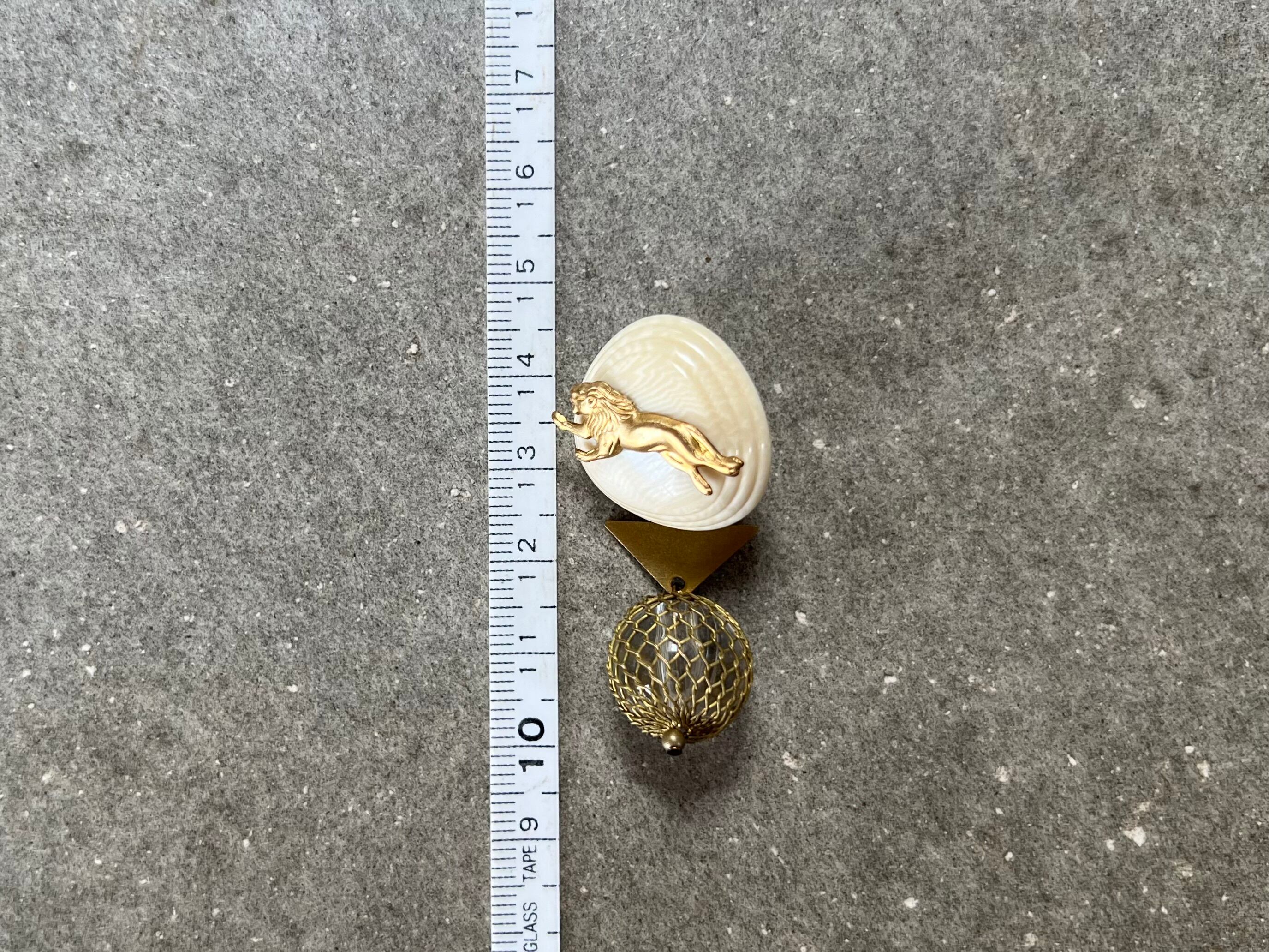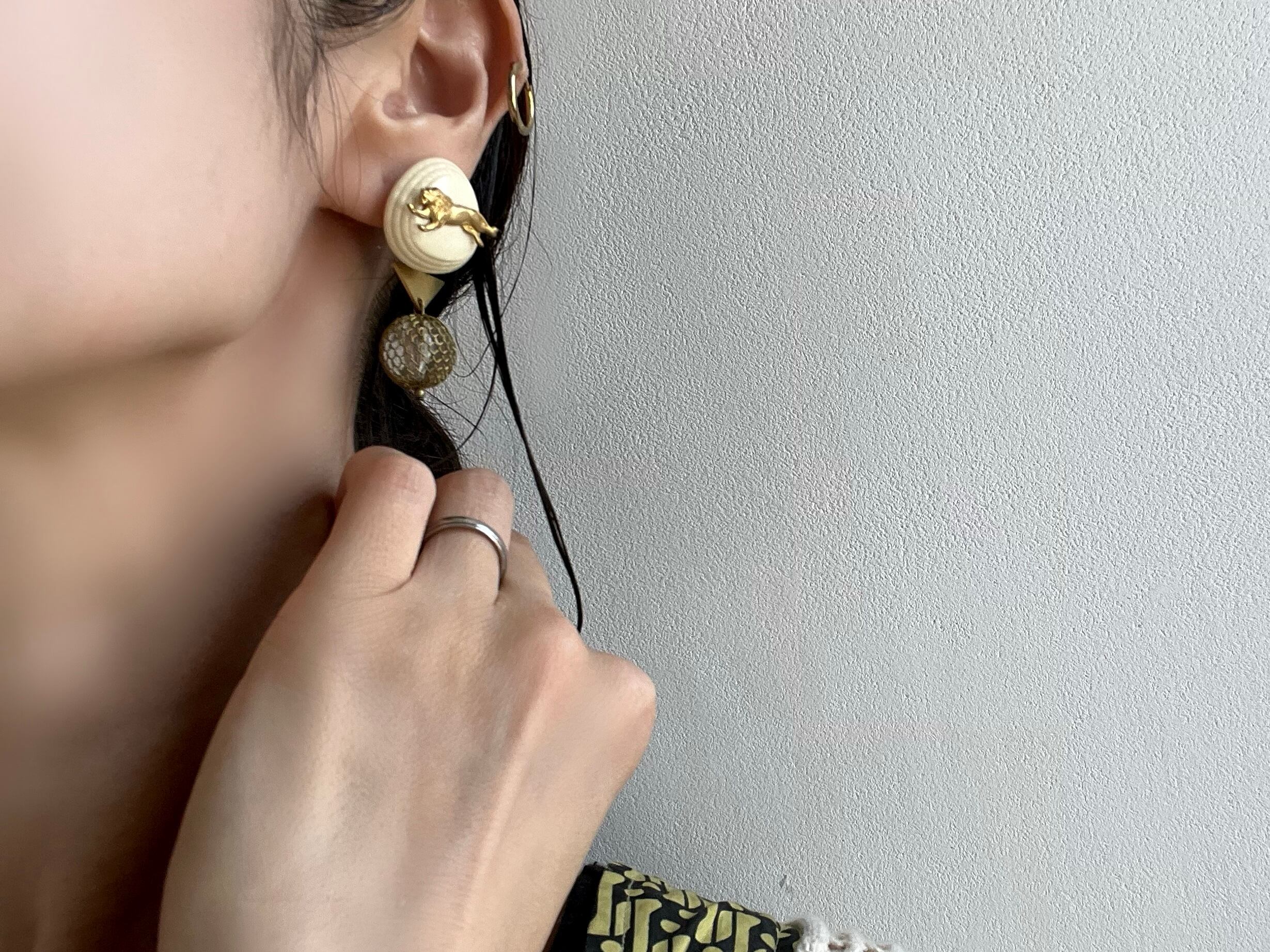 ライオンチャームを置いたガゼイン樹脂をカボションにメッシュボールを合わせ、ボリュームのあるデザインに仕上げました。