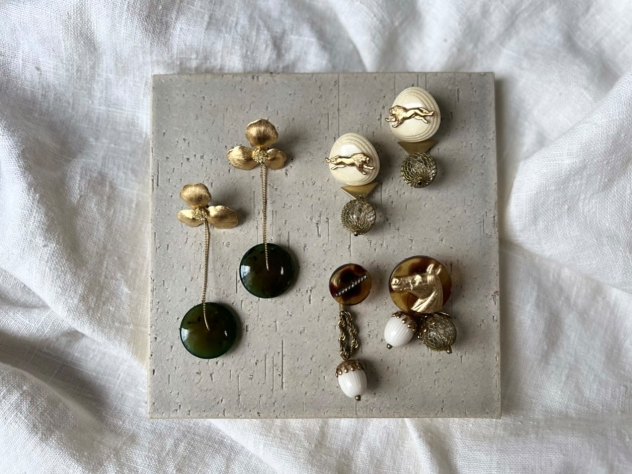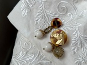 ヴィンテージパーツを使用してアシンメトリーなピアスを作りました。