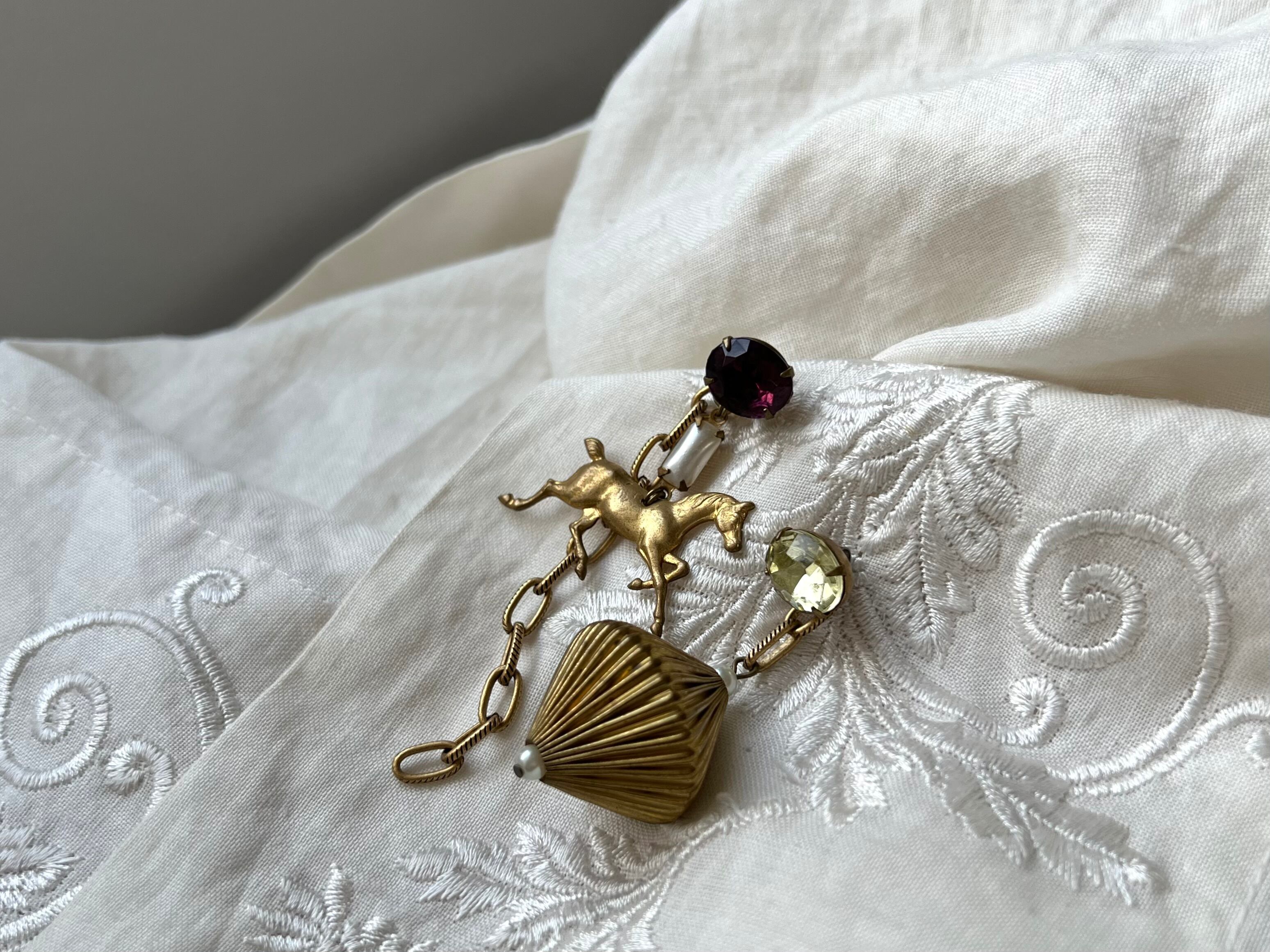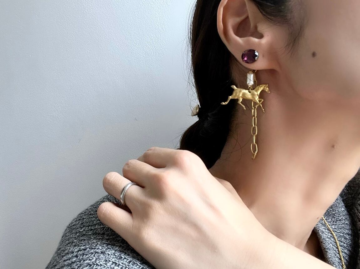 ライトイエローやパープルのガラス、ボリューミーな真鍮パーツや存在感のあるランニングホースチャームが個性的なデザインです。
