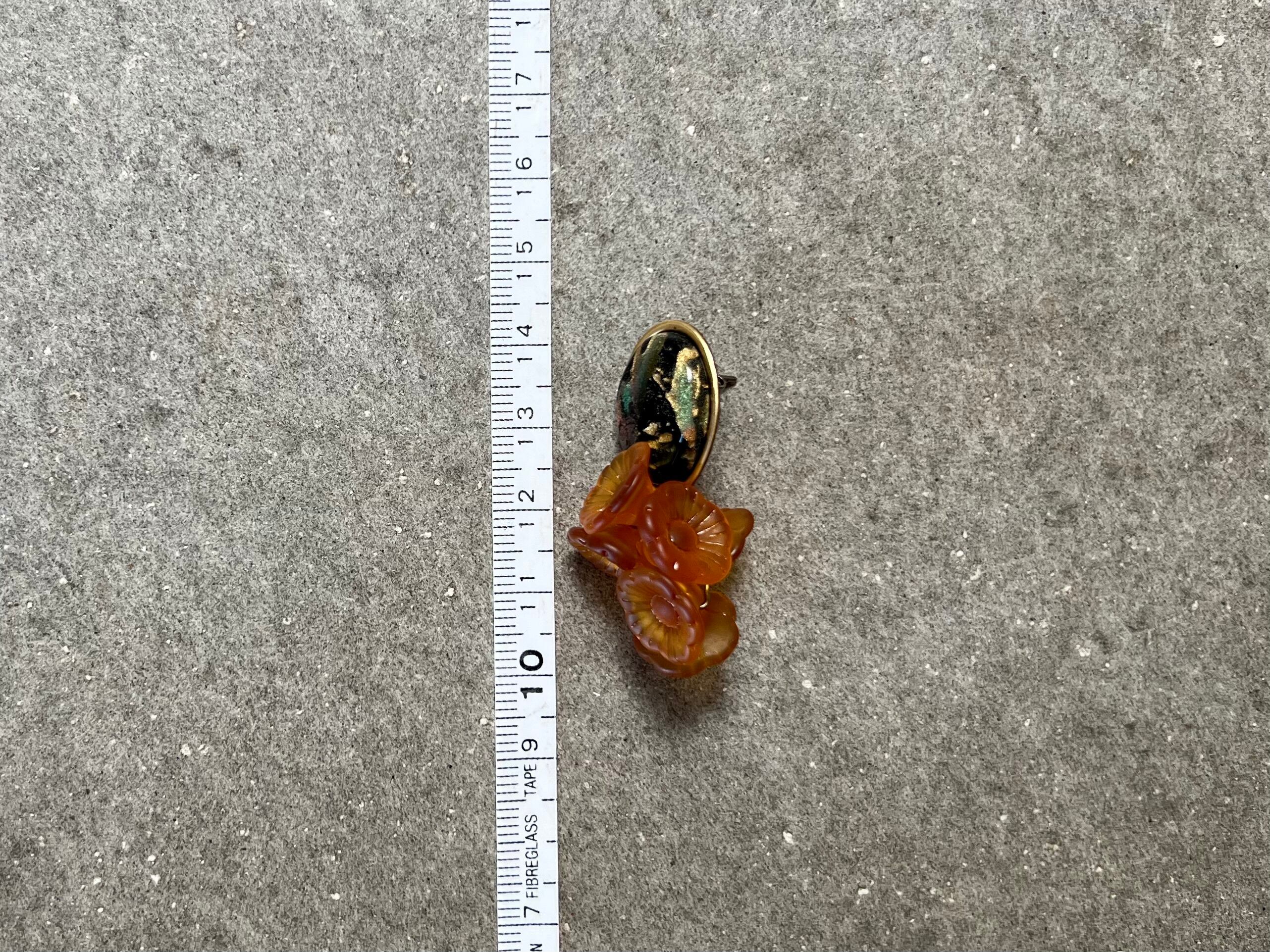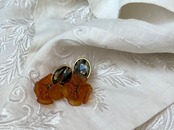 マーブル模様の印象的なブラックベースのカボションに、琥珀色をしたドイツガラスのフラワービーズを重ねました。