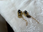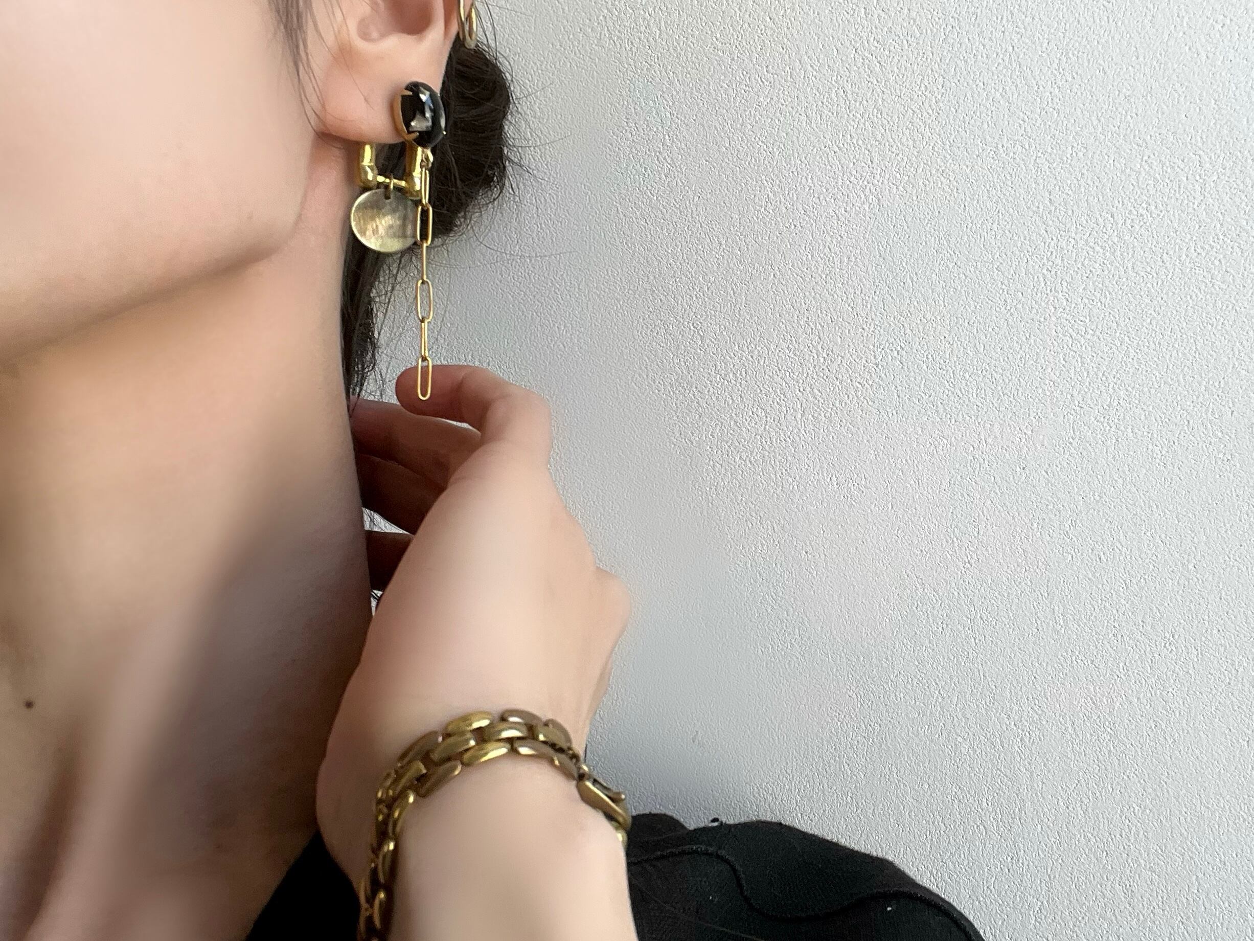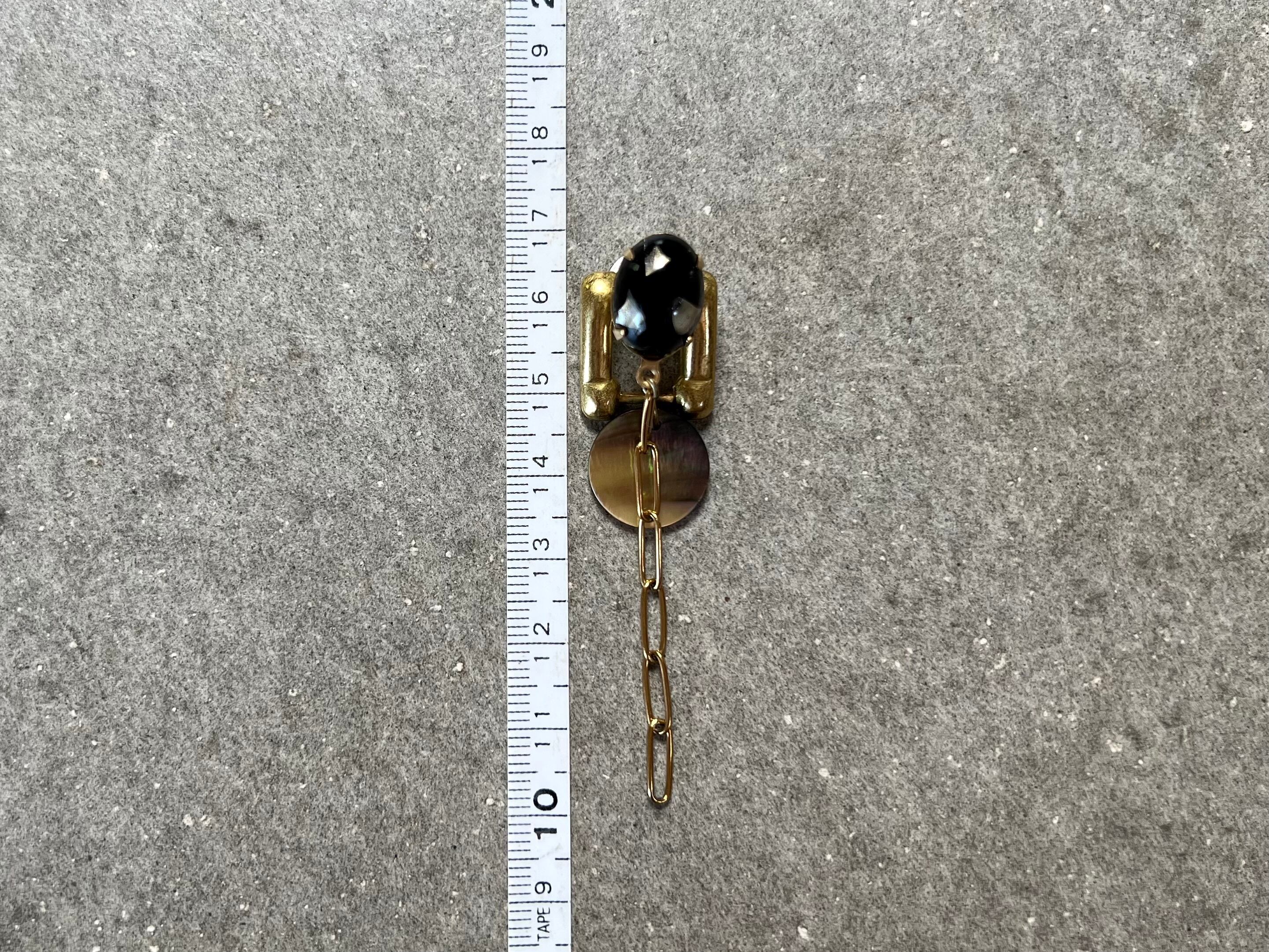 シェルの入ったブラックカボションに、細いチェーンとごつめのチェーンを合わせてシックで大人っぽい印象に仕上げました。