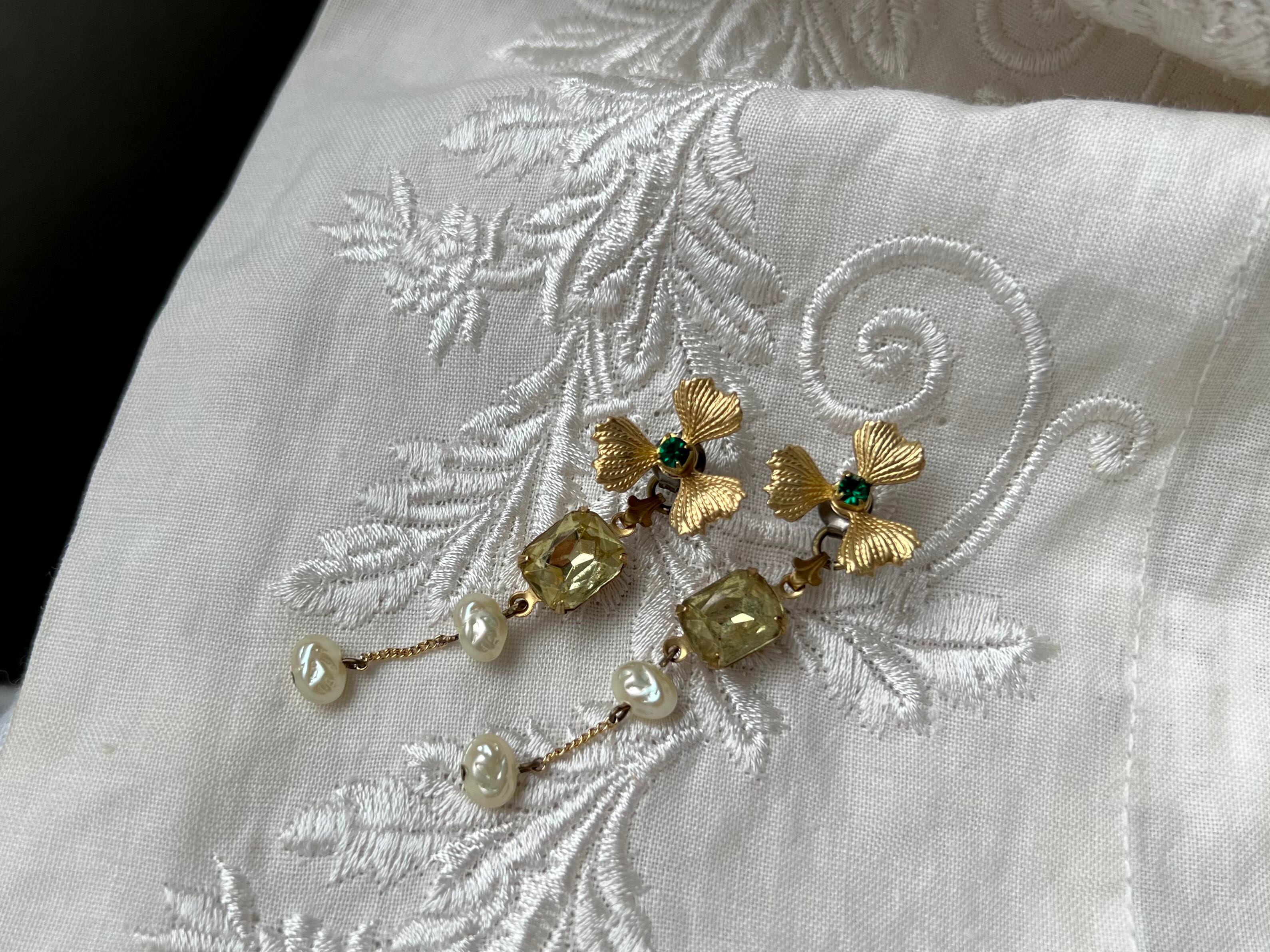 グリーンのスワロフスキーを置いた小花のカボションに淡いレモンイエローのガラスとライスパールを合わせています。