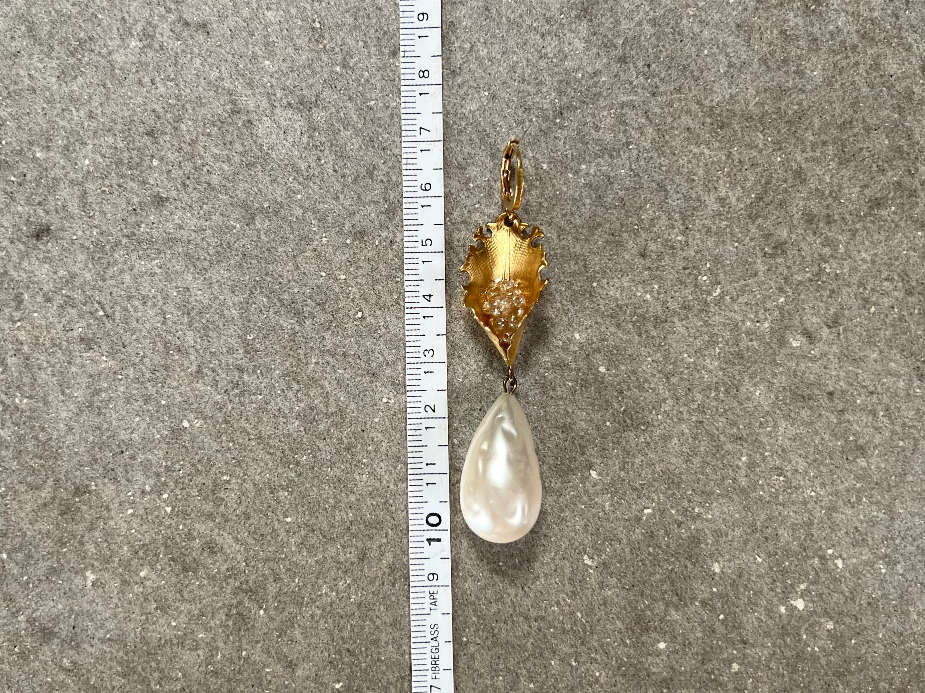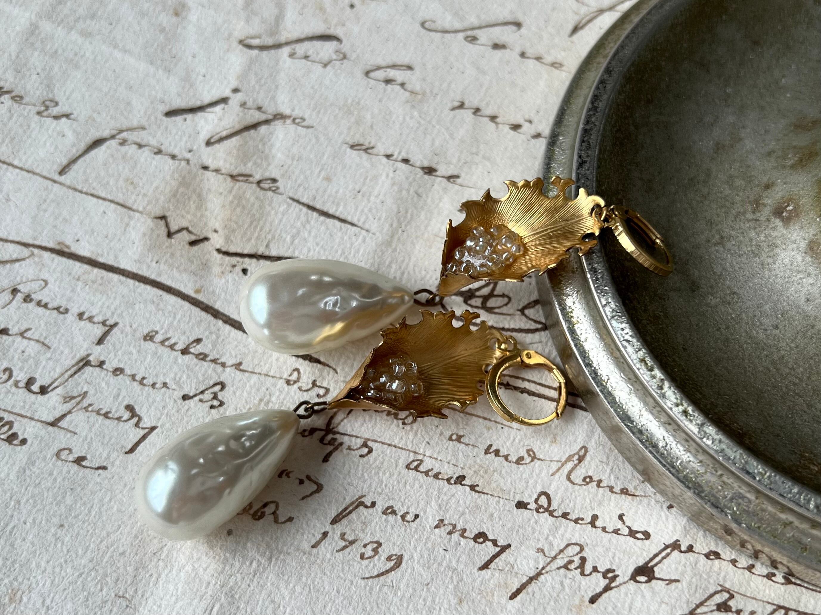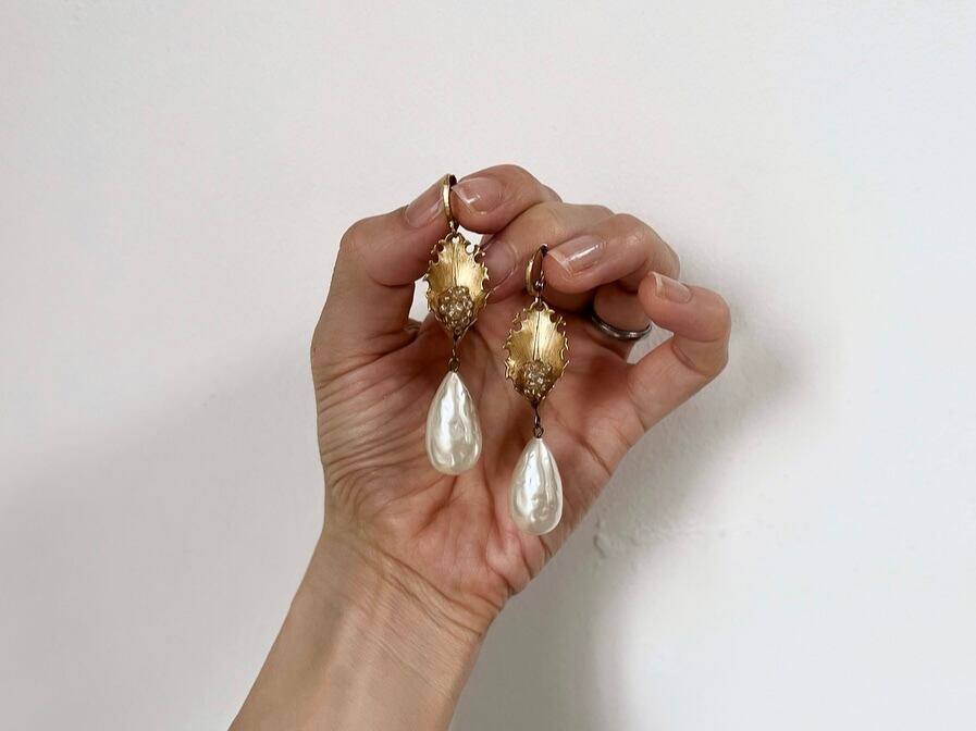 存在感のあるミリアムハスケルの美しいドロップガラスパールを主役に、シードビーズを添えたボタニカルパーツをアクセントに繋いでいます。