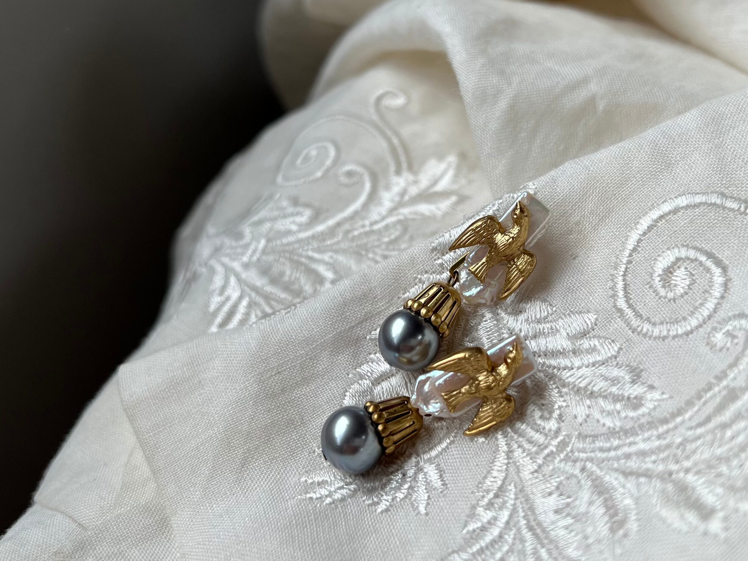 淡水パールにミリアムハスケルののドープを置いたカボションと、ライトグレーのガラスパールの組み合わせがとても上品な印象です。