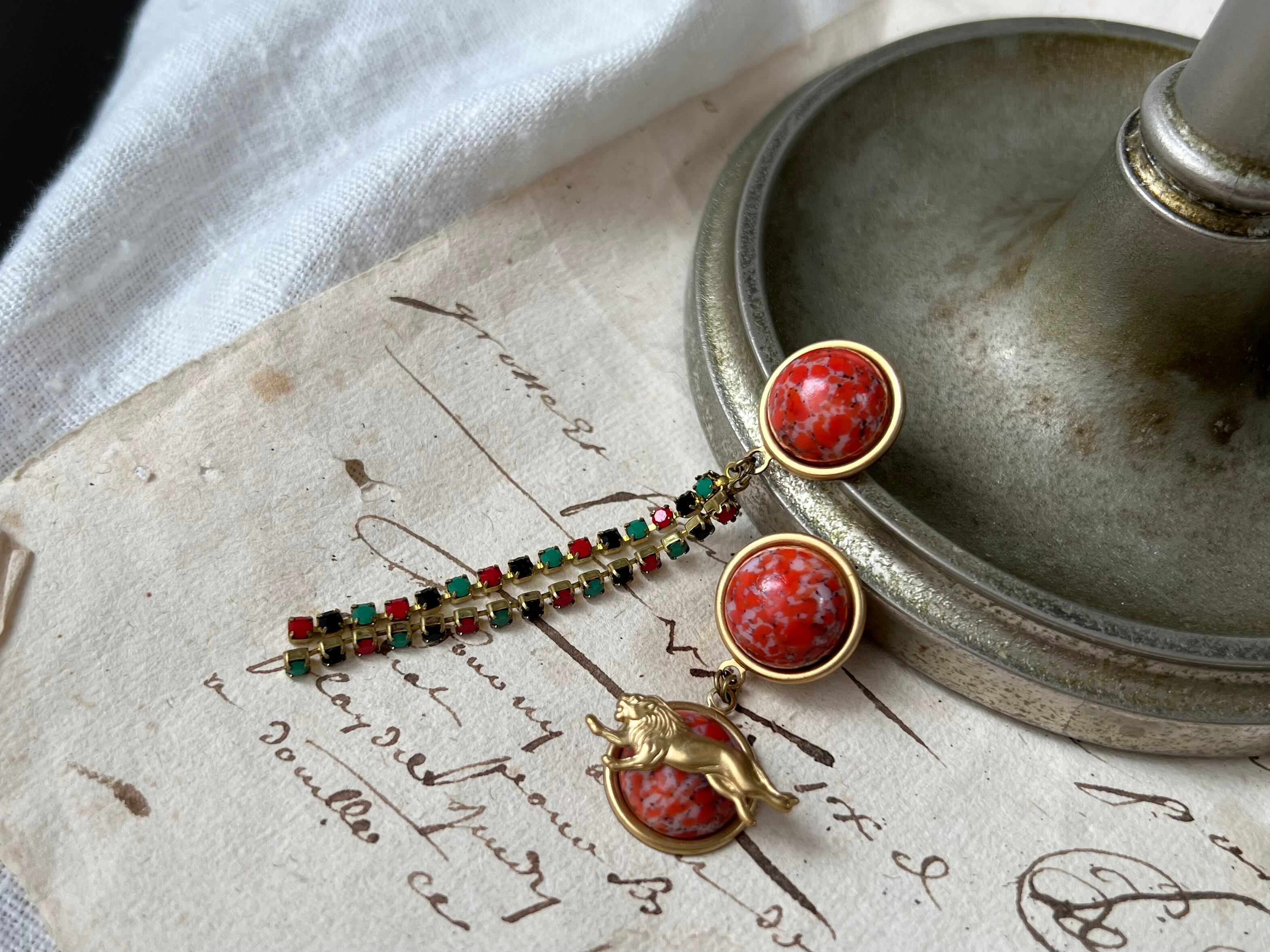 ヴィンテージパーツを使用してアシンメトリーなピアスを作りました。