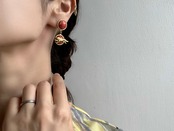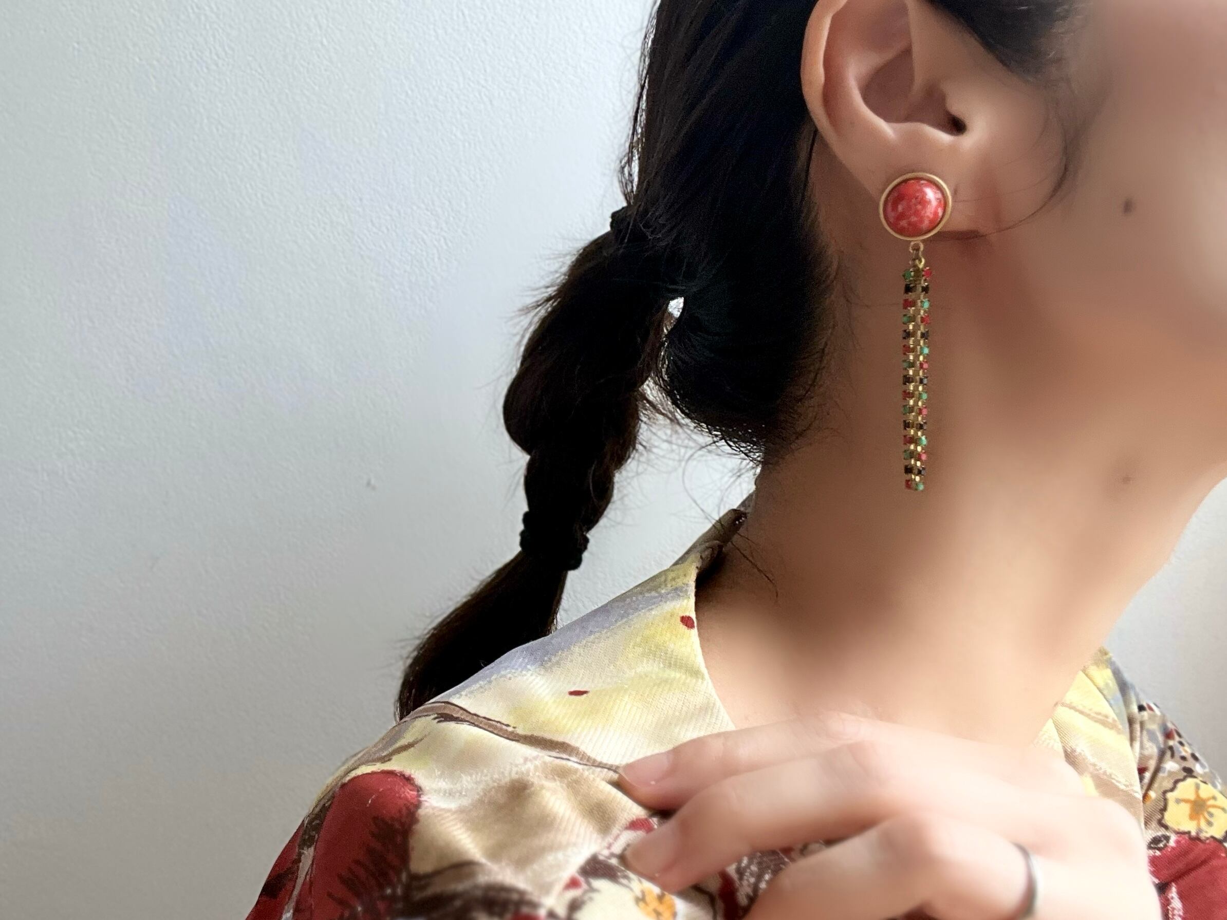 シンプルなデザインながらも程よい存在感があり、肌によく映える赤や長めに取ったスワロフスキーが印象的です。