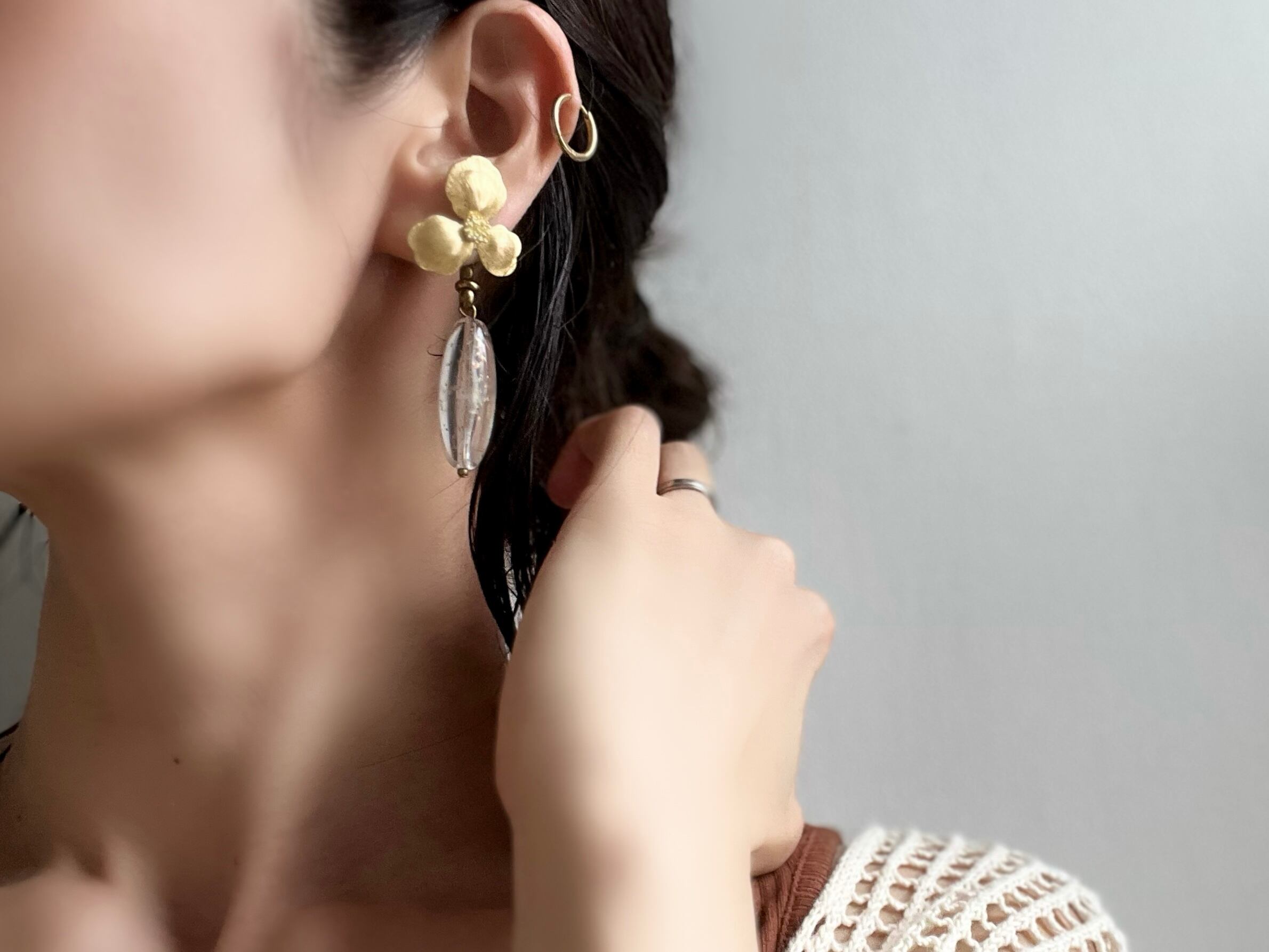 大ぶりのボタニカルパーツをカボションに、やはりボリュームのあるクリアビーズを添えています。