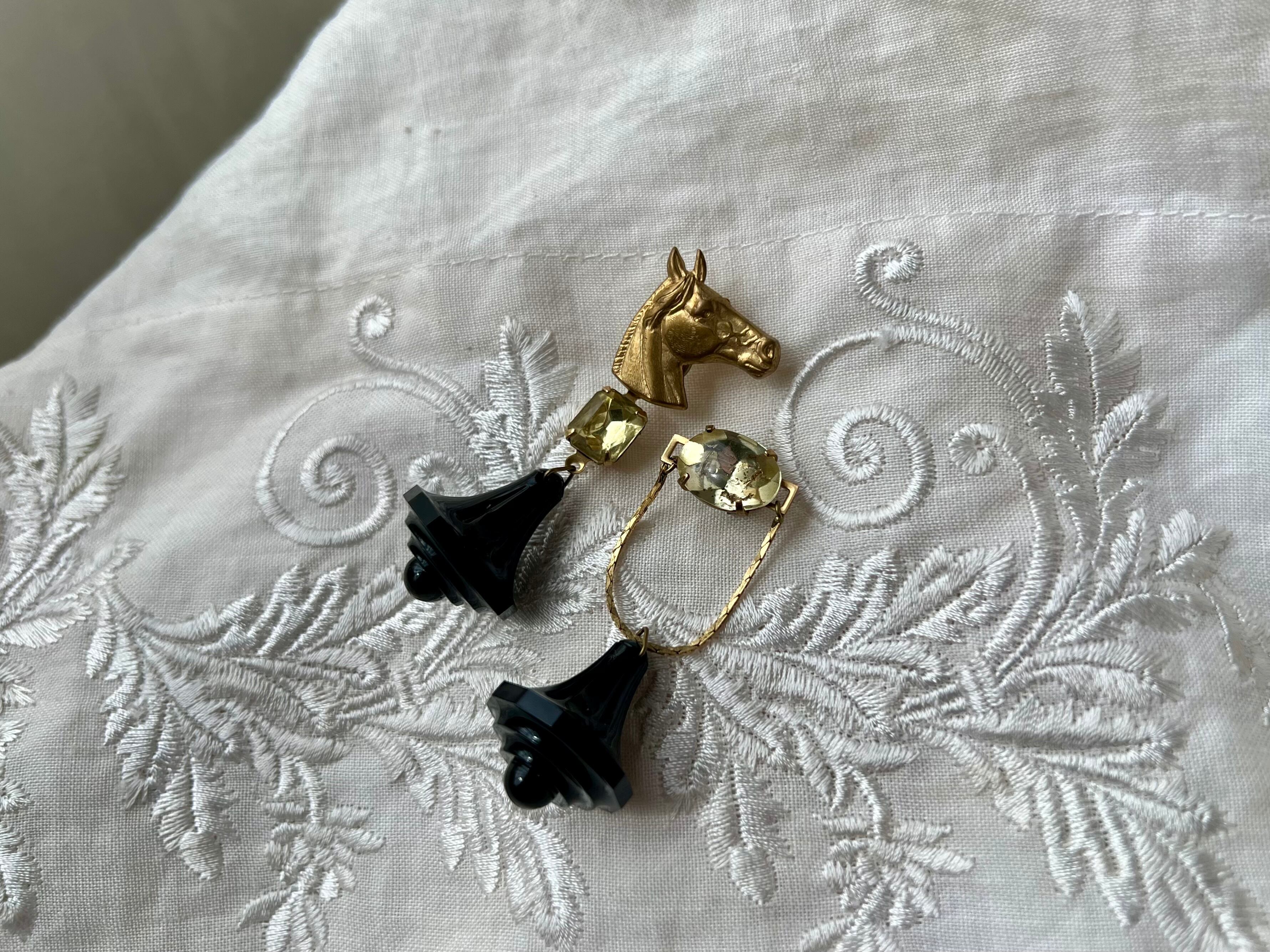 ホースチャームやチェスの駒のようなブラックビーズなど、個性的なパーツを柔らかなシトリンカラーのガラスで調和を取っています。