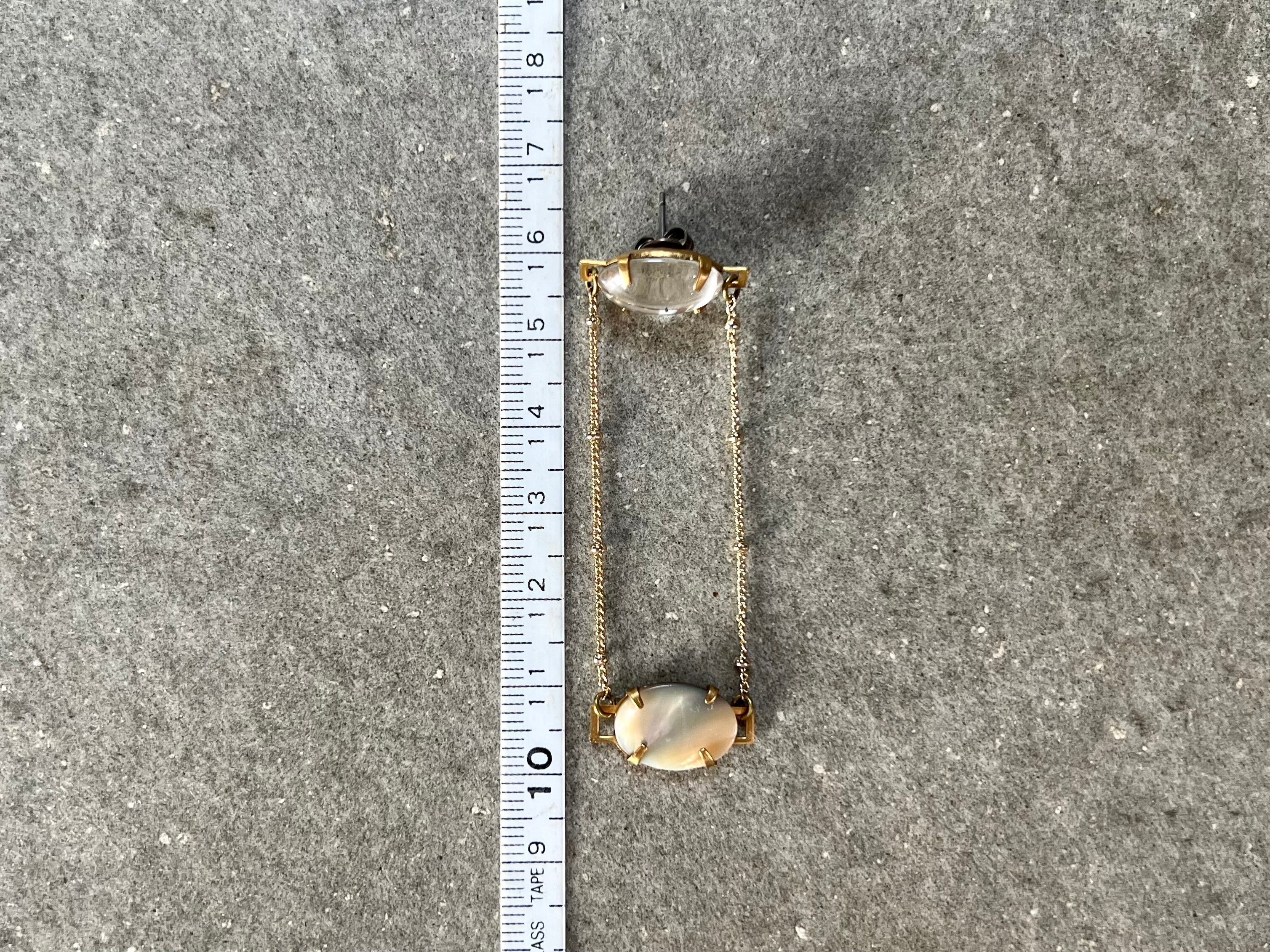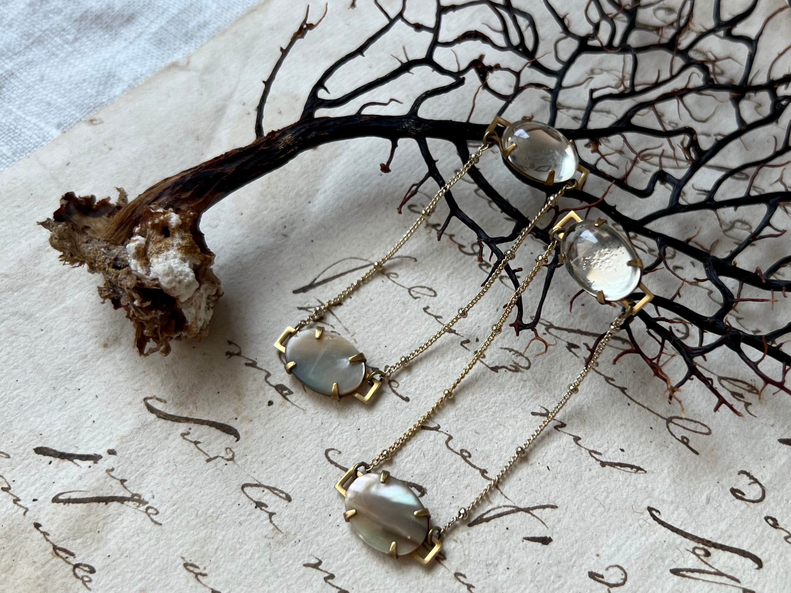 クリアガラスドームをカボションに、シェルを華奢なチェーンで繋いでいます。