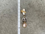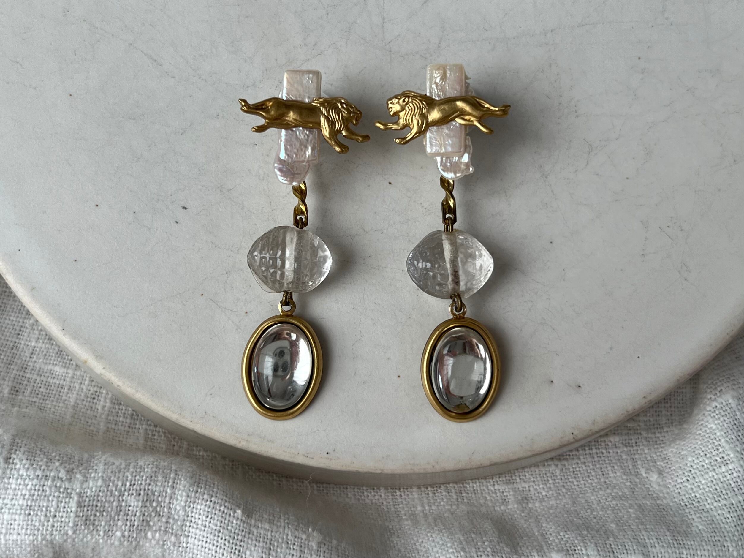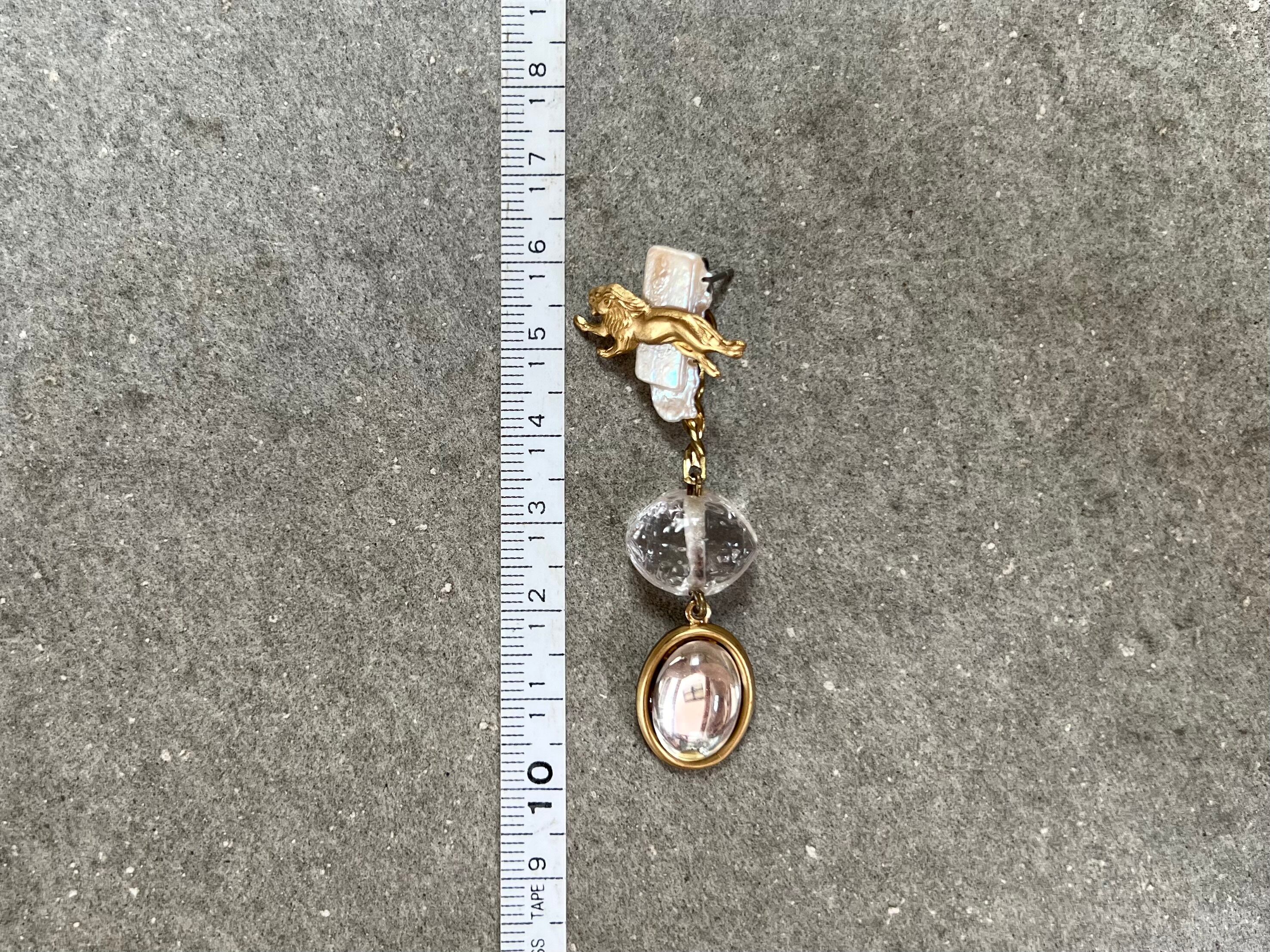 ライオンチャームを添えた淡水パールカボションに、異なったガラスを連ねて仕上げました。