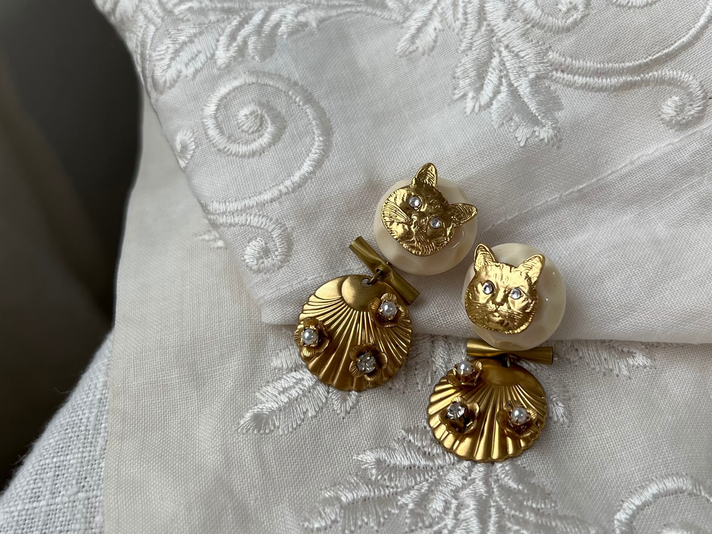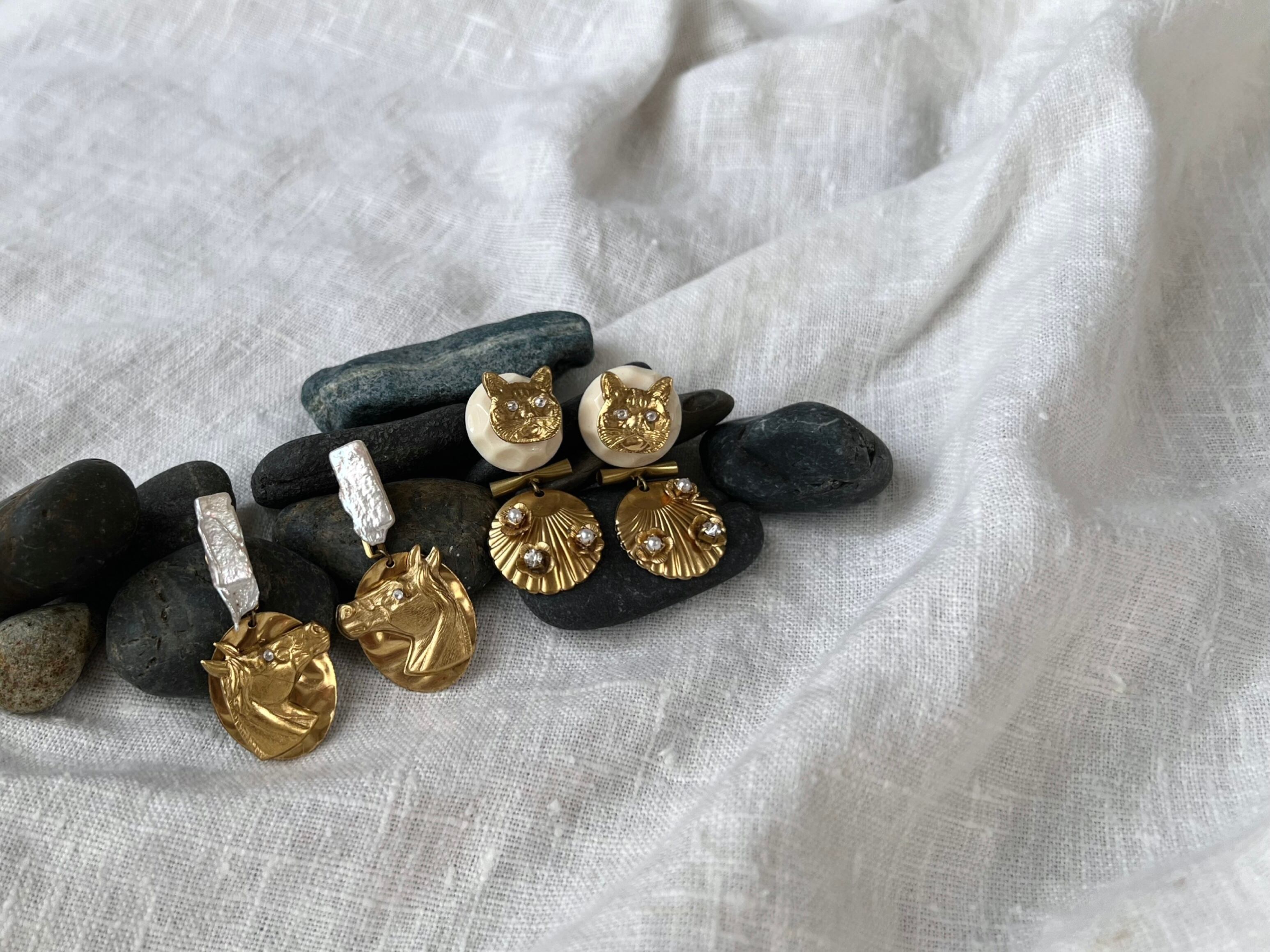 カットの施されたドームにスワロフスキーの目を嵌めたネコのチャームを置いたカボションにパールや小花を散らしたシェルチャームを添えました。