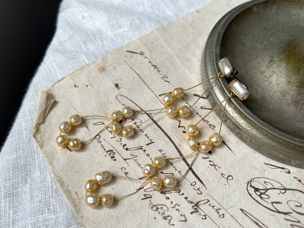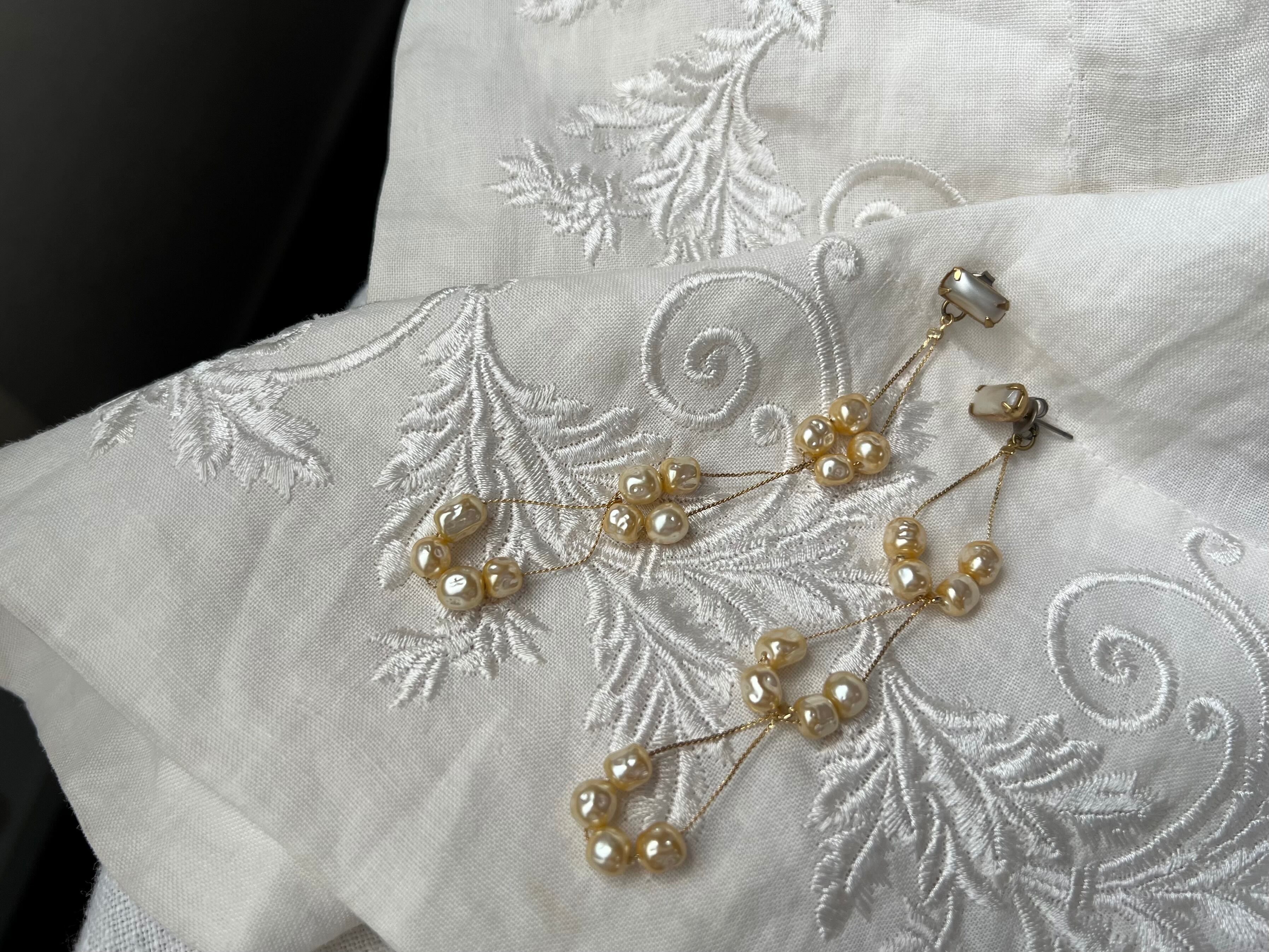 ミリアムハスケルのパールをカボションに、小粒のガラスパールを繊細なチェーンで繋げています。