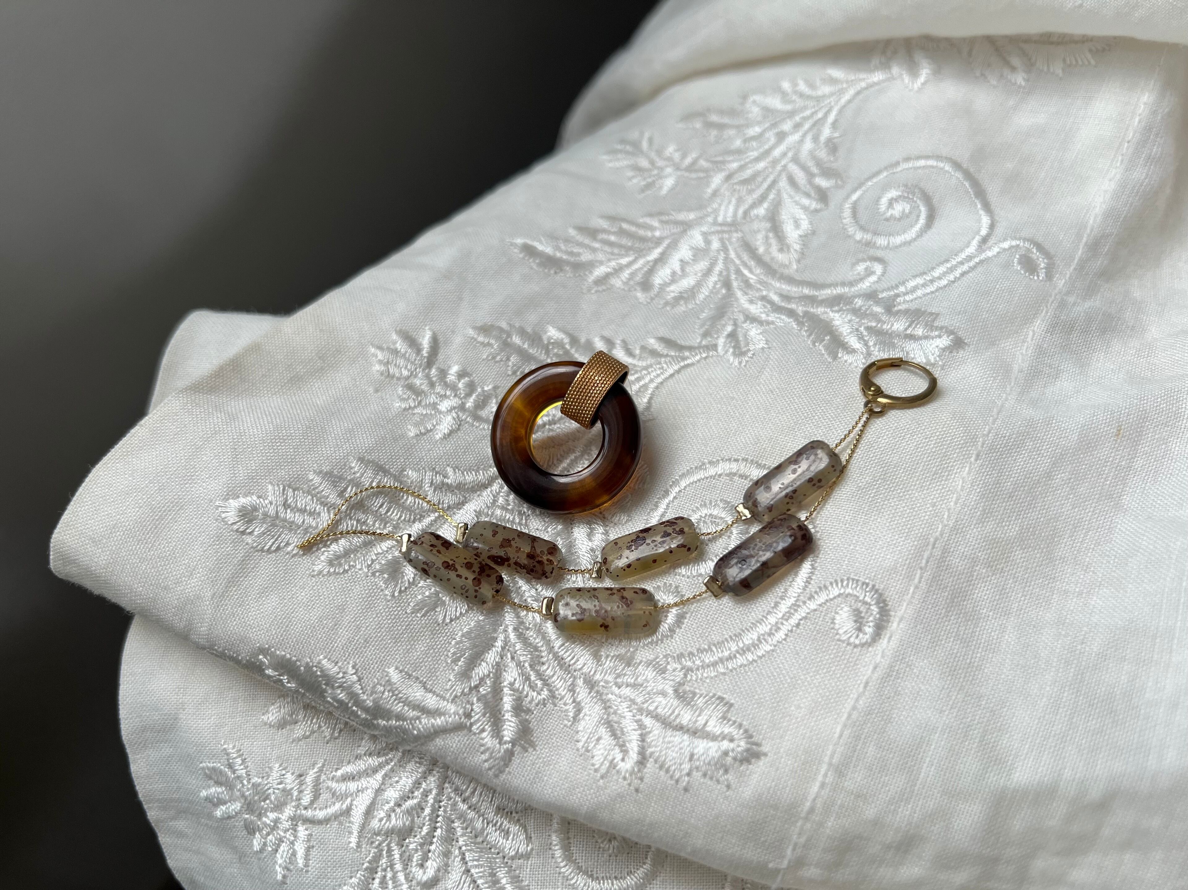 片方にはミリアムハスケルのブラスを嵌めた鼈甲リング、もう片方には馬渡模様のレクタングルビーズを長めのチェーンで吊るしました。