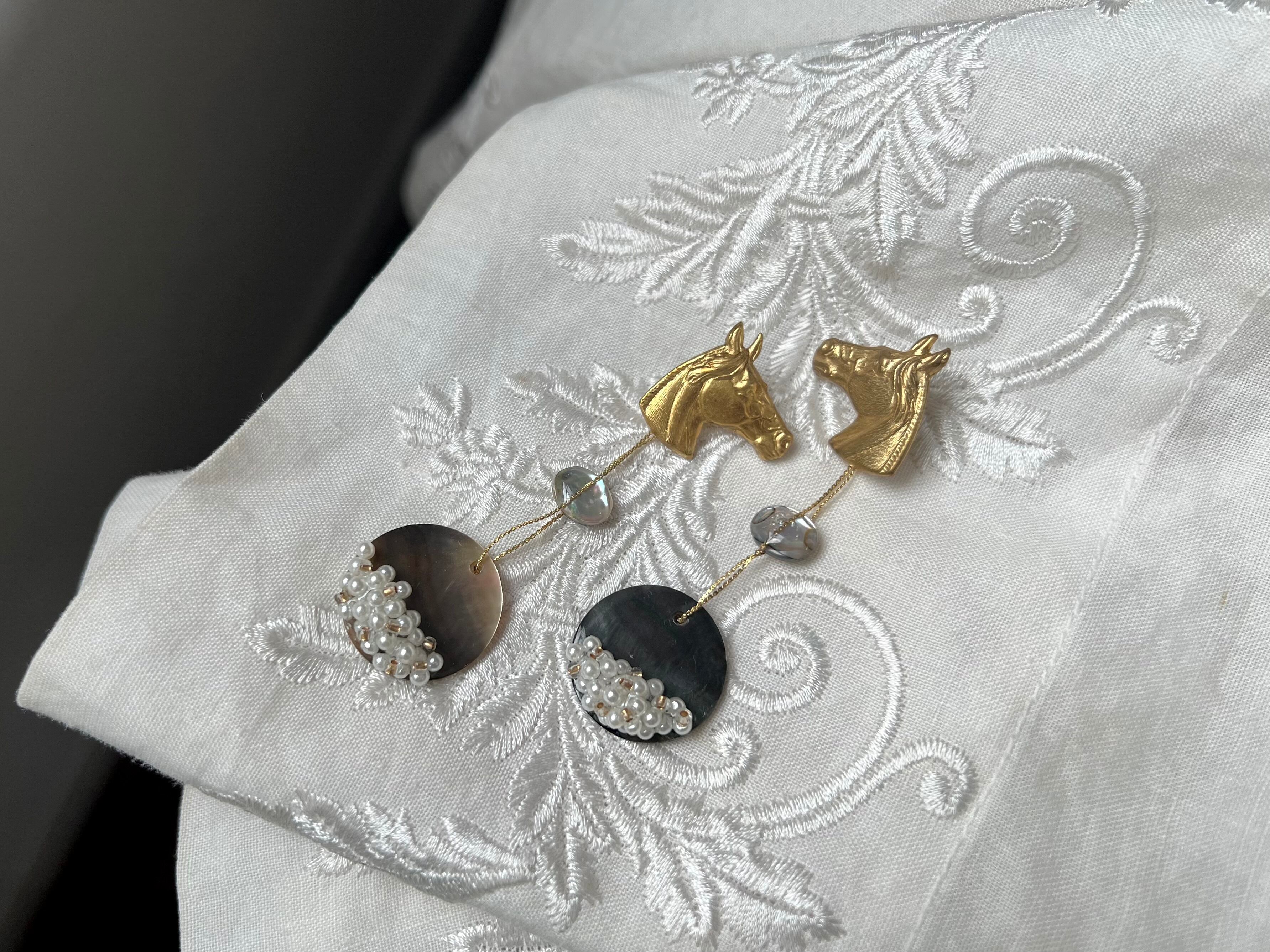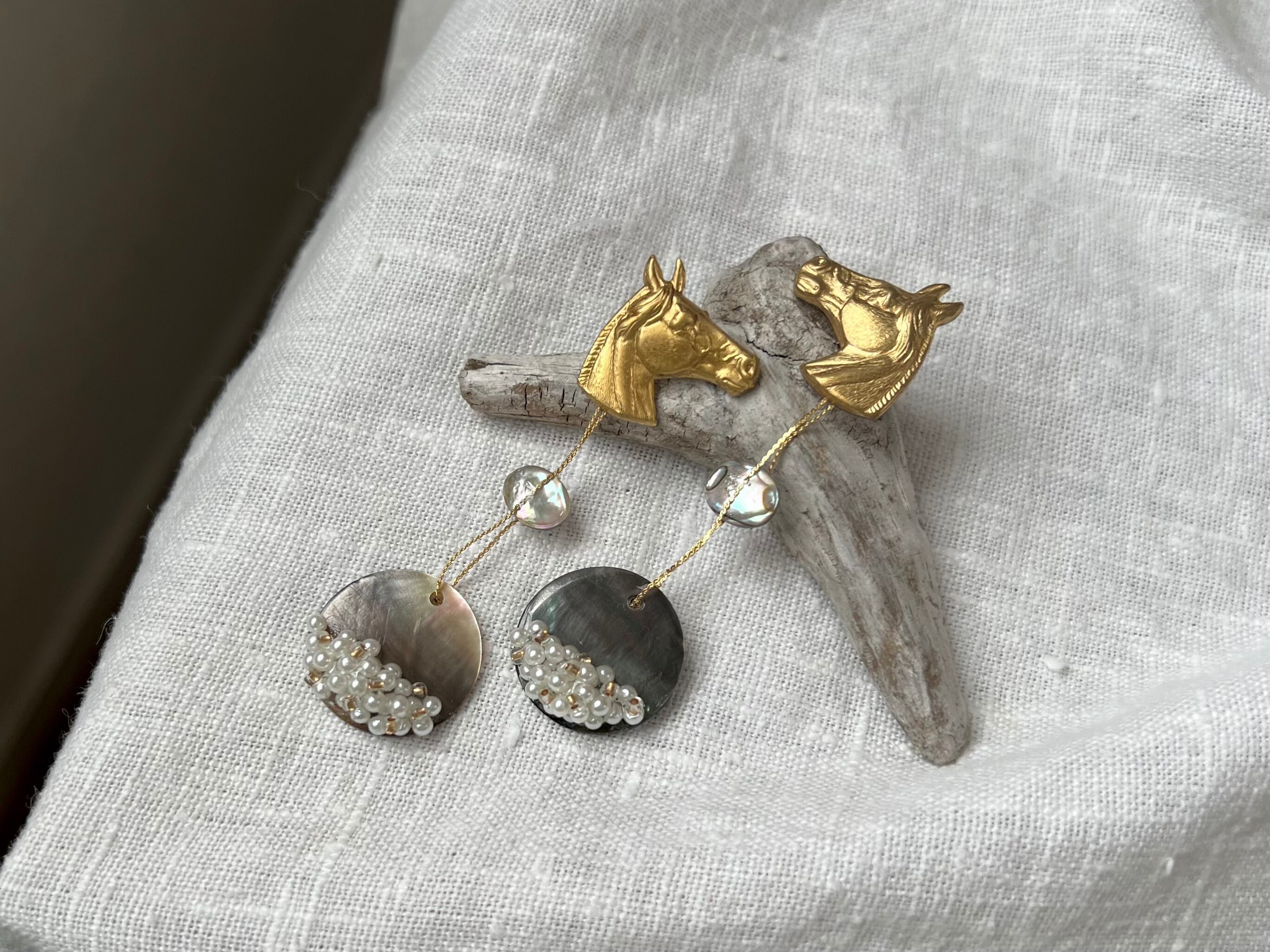 ホースチャームをカボションに、パールを散らしたシェルをチェーンで吊るしています。