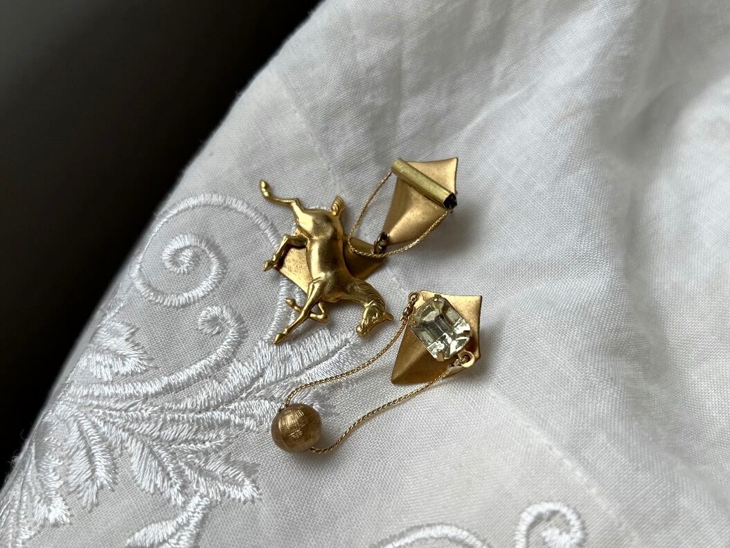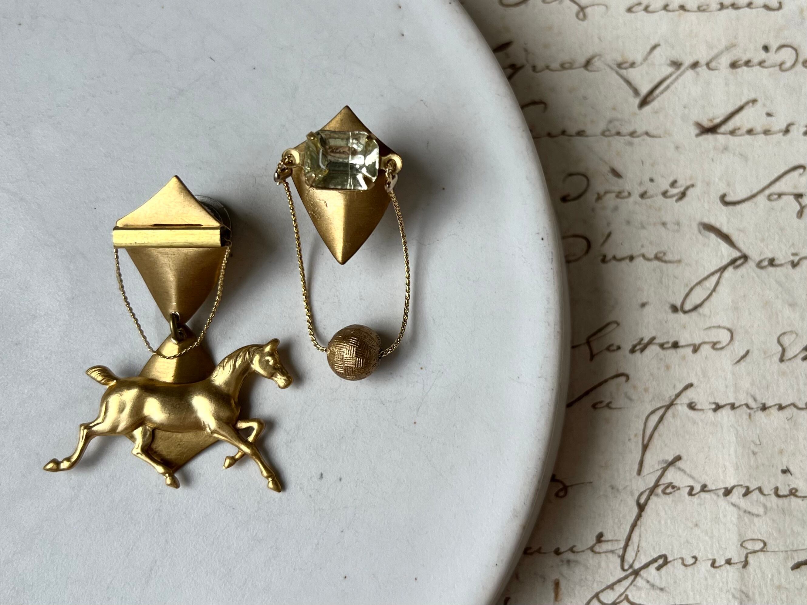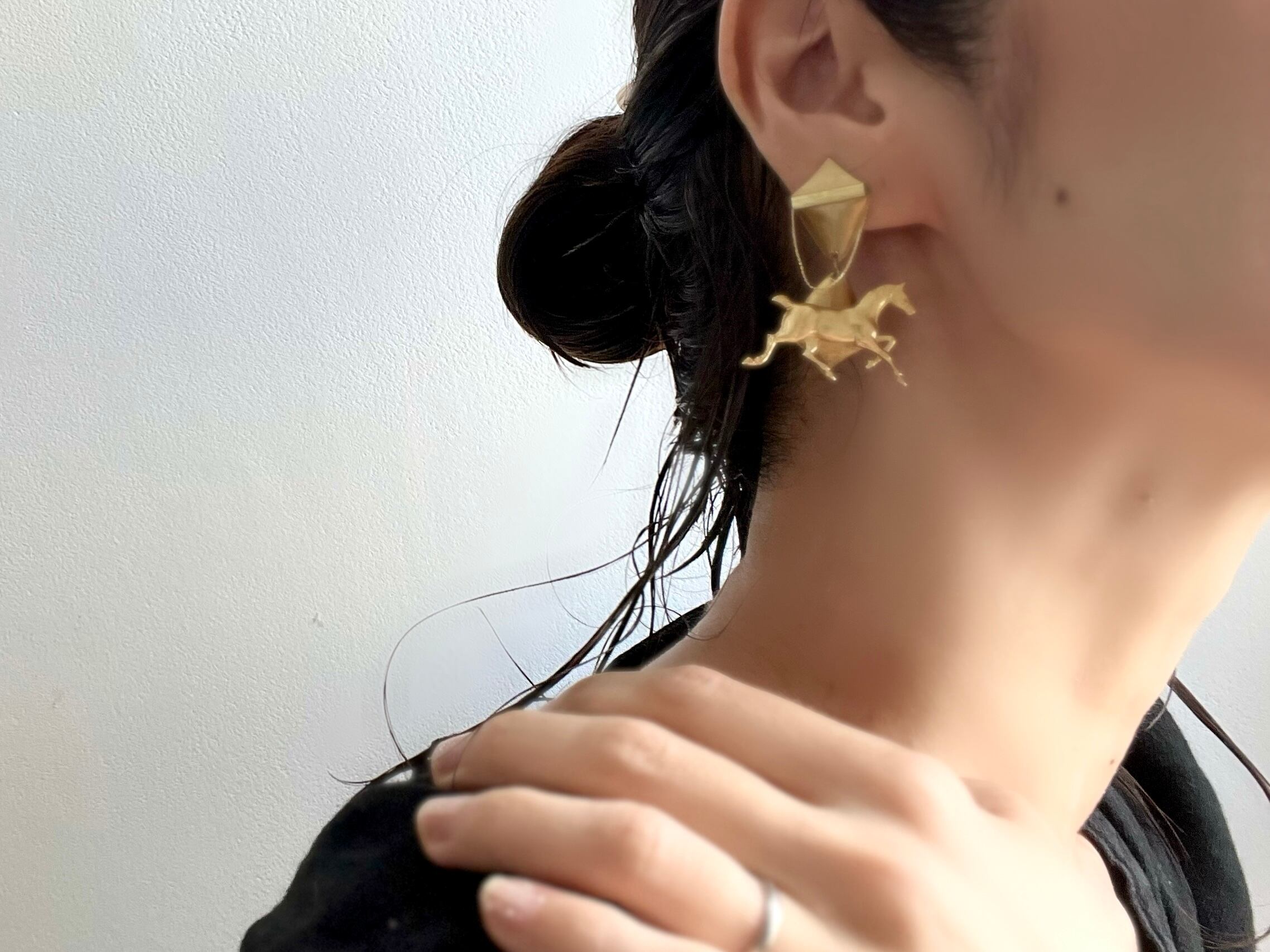 シールドシェイプのブラスパーツをベースにホースチャームやガラスストーン、チェーンなどを組み合わせて遊び心を持たせています。