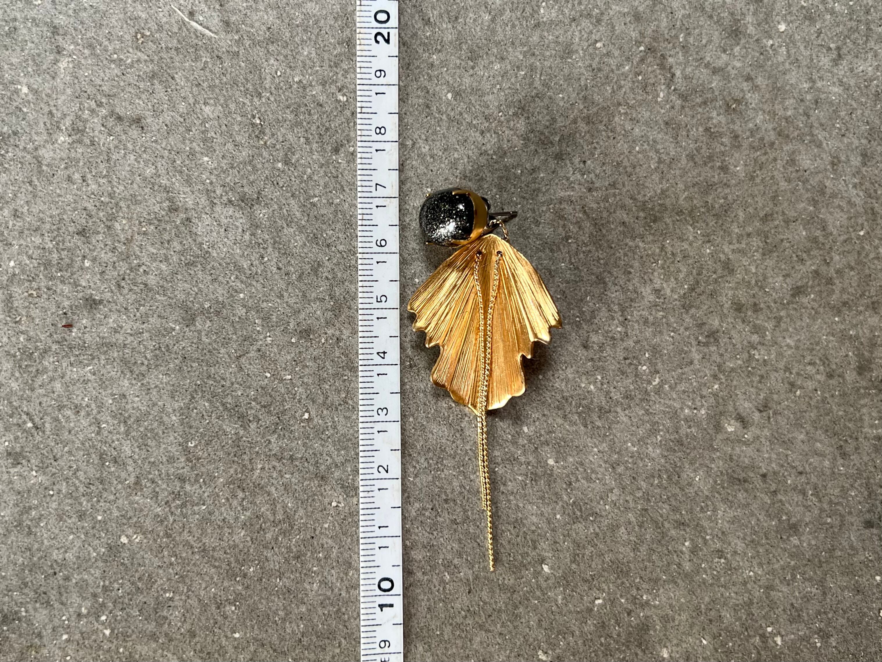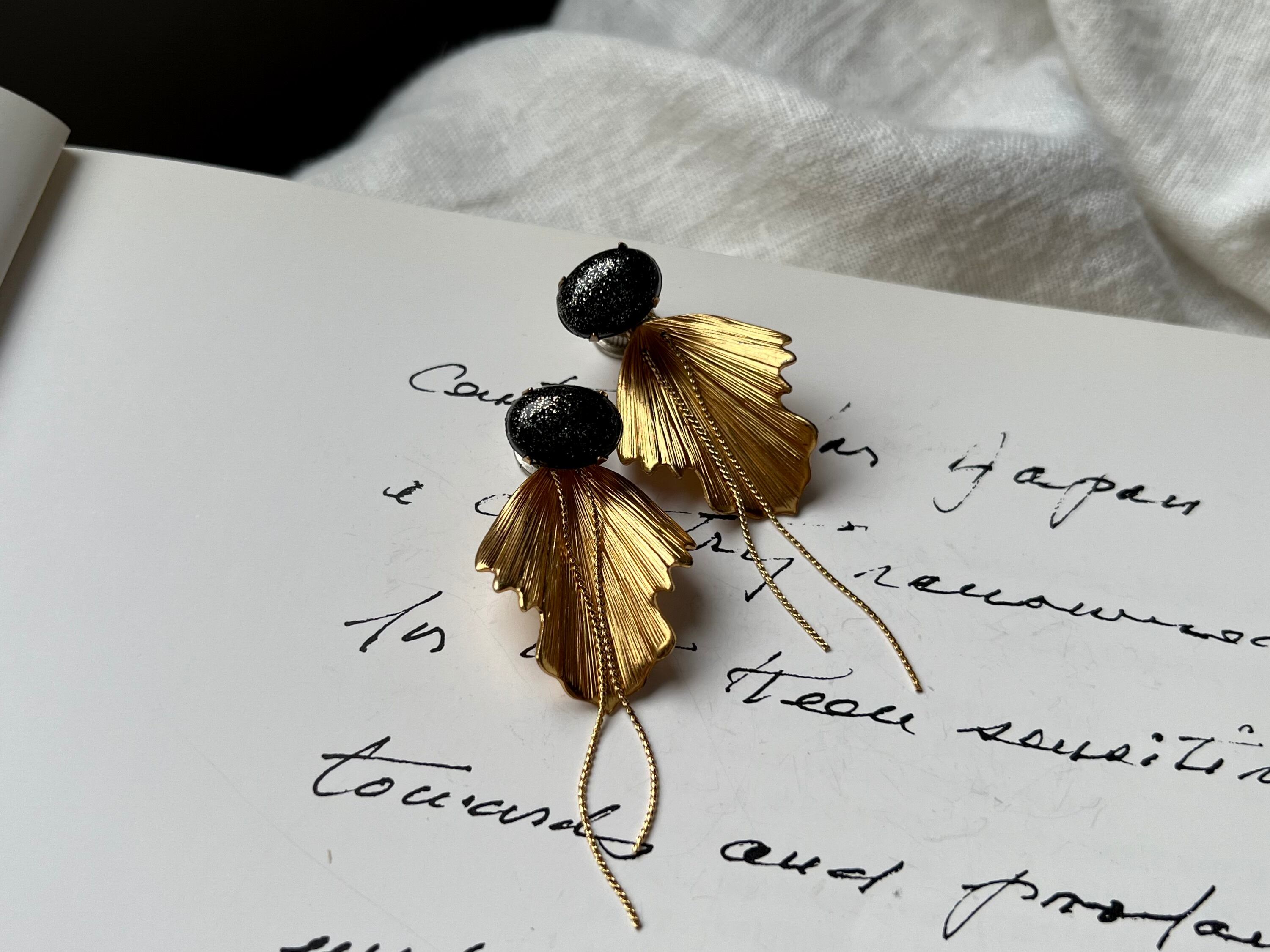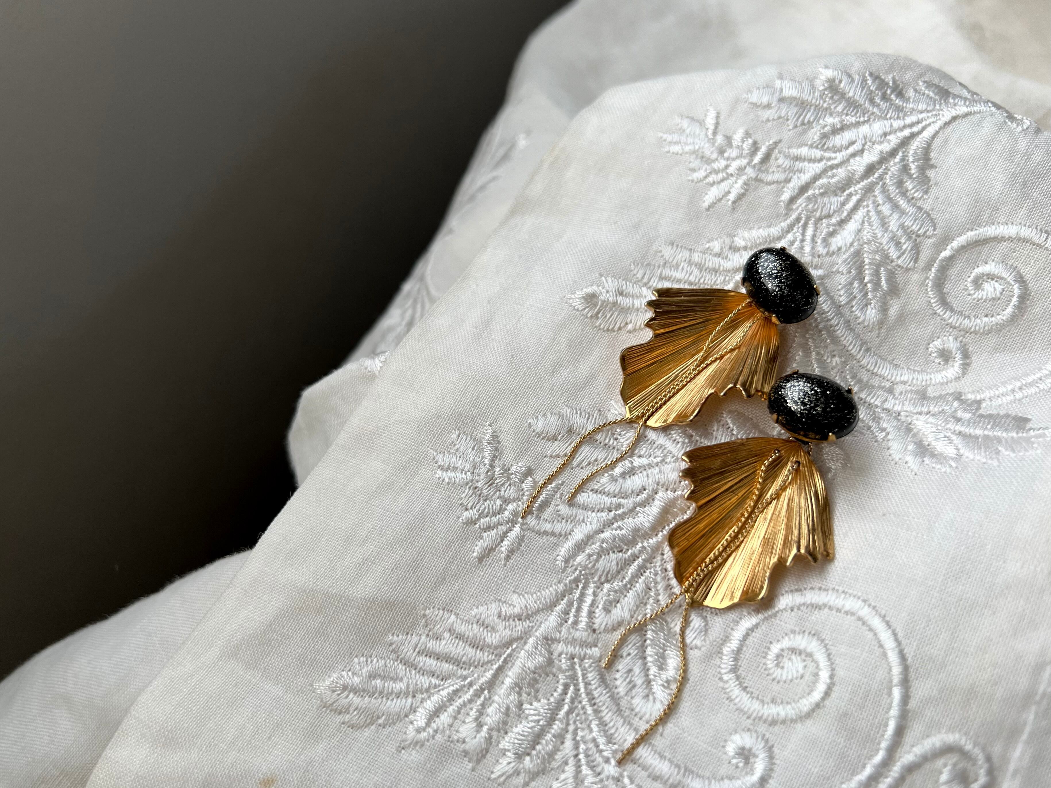 ラメの入ったブラックカボションにチェーンを通したミリアムハスケルのパーツを添えています。