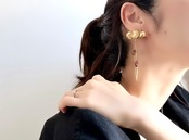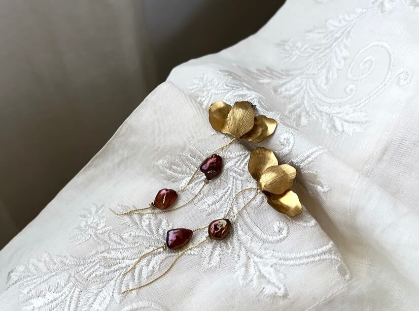 ボタニカルパーツに淡水パールを添えたシンプルなデザインで、パールの深い色味や繊細なチェーンの長さが、大人っぽいシックな仕上がりです。