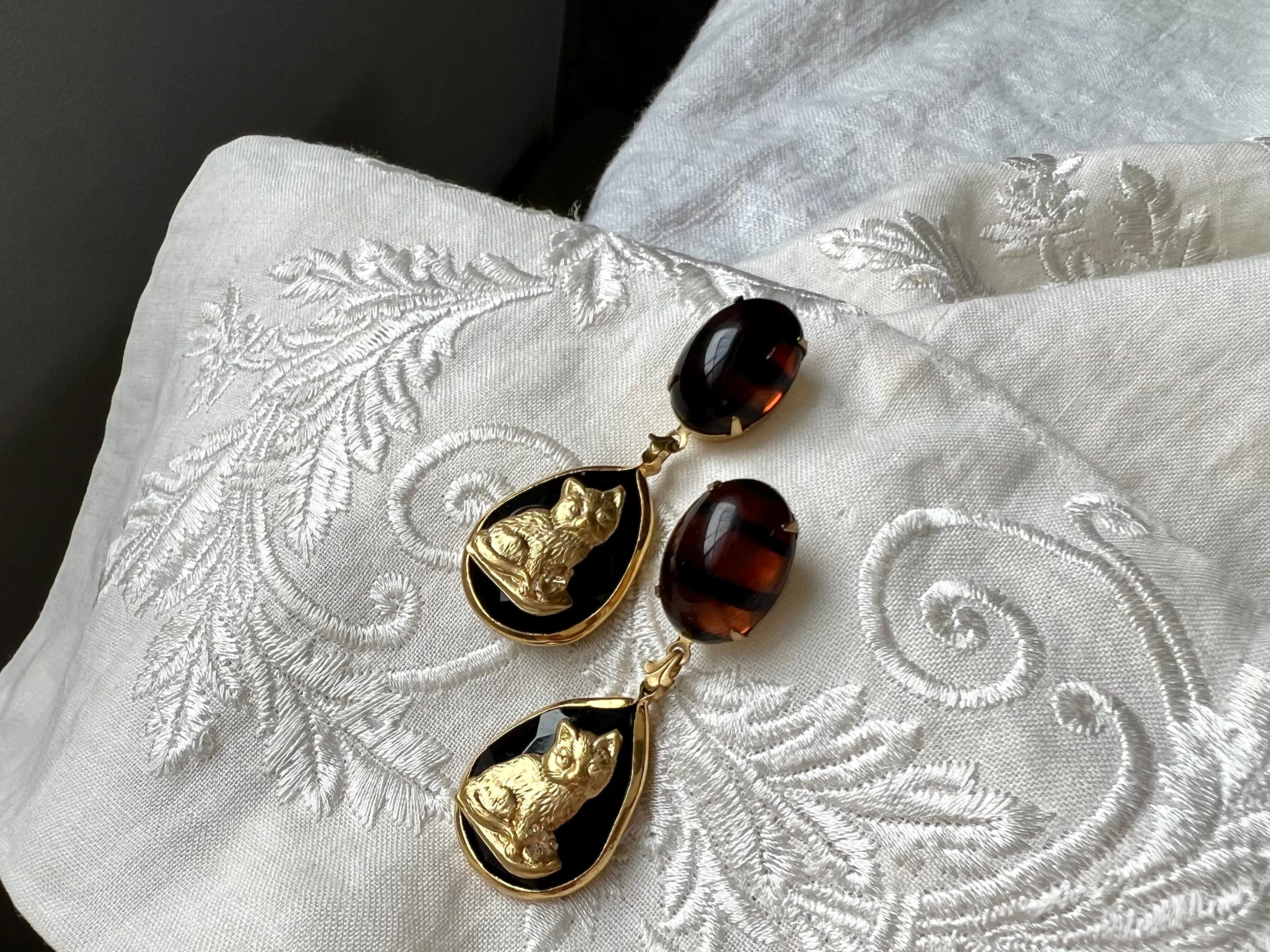 ボーダーの入ったアンバーカラーのガラスをカボションに、ネコのチャームを置いたブラックドロップを合わせました。