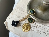 グリーン×ブラックをベースにしたガラスカボションにチェスの駒のようなモチーフのビーズとライオンチャームを合わせました。