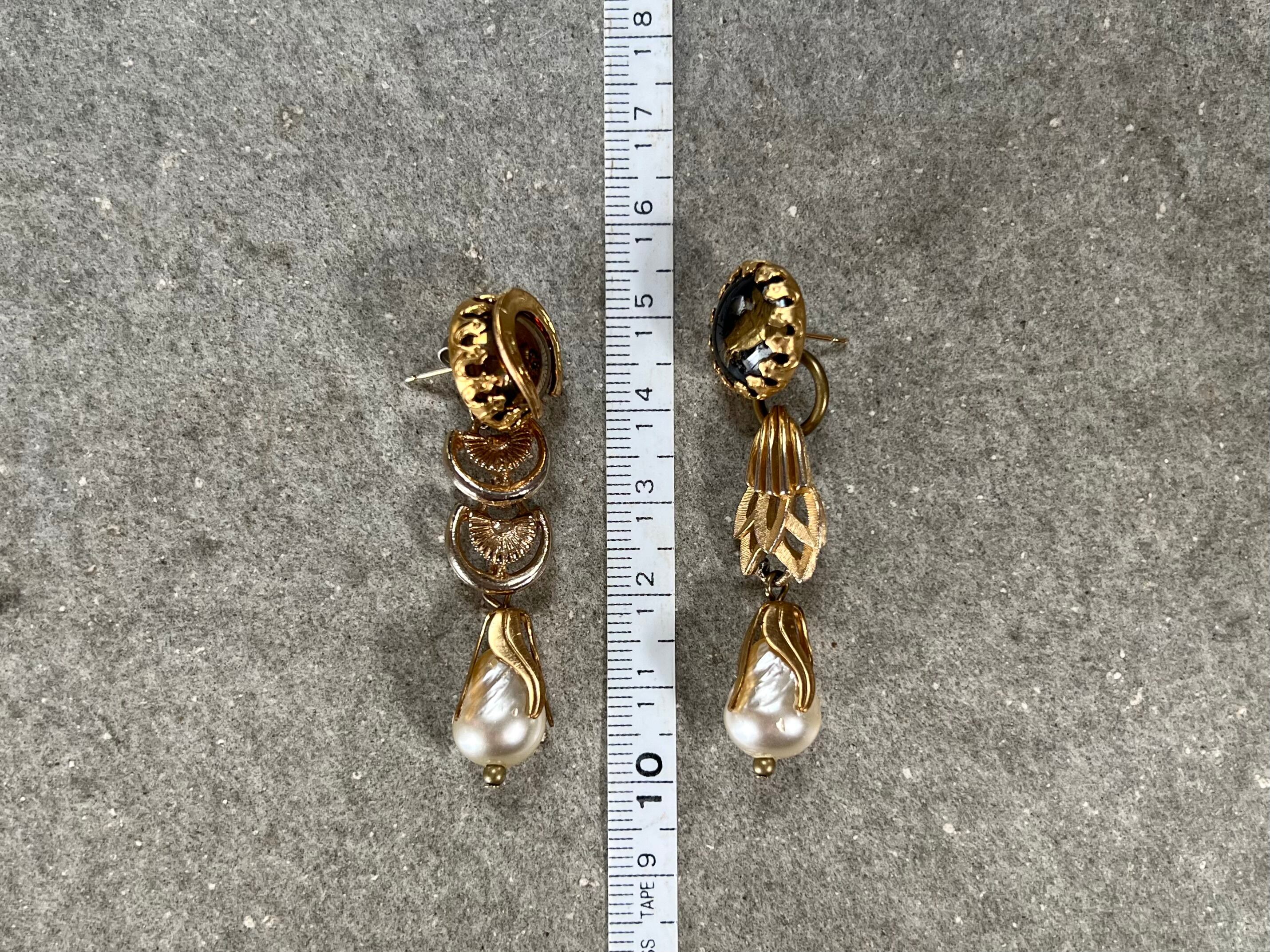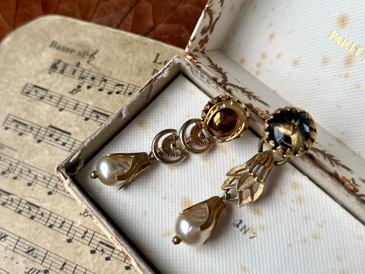 ヴィンテージパーツを使用してアシンメトリーなピアスを作りました。