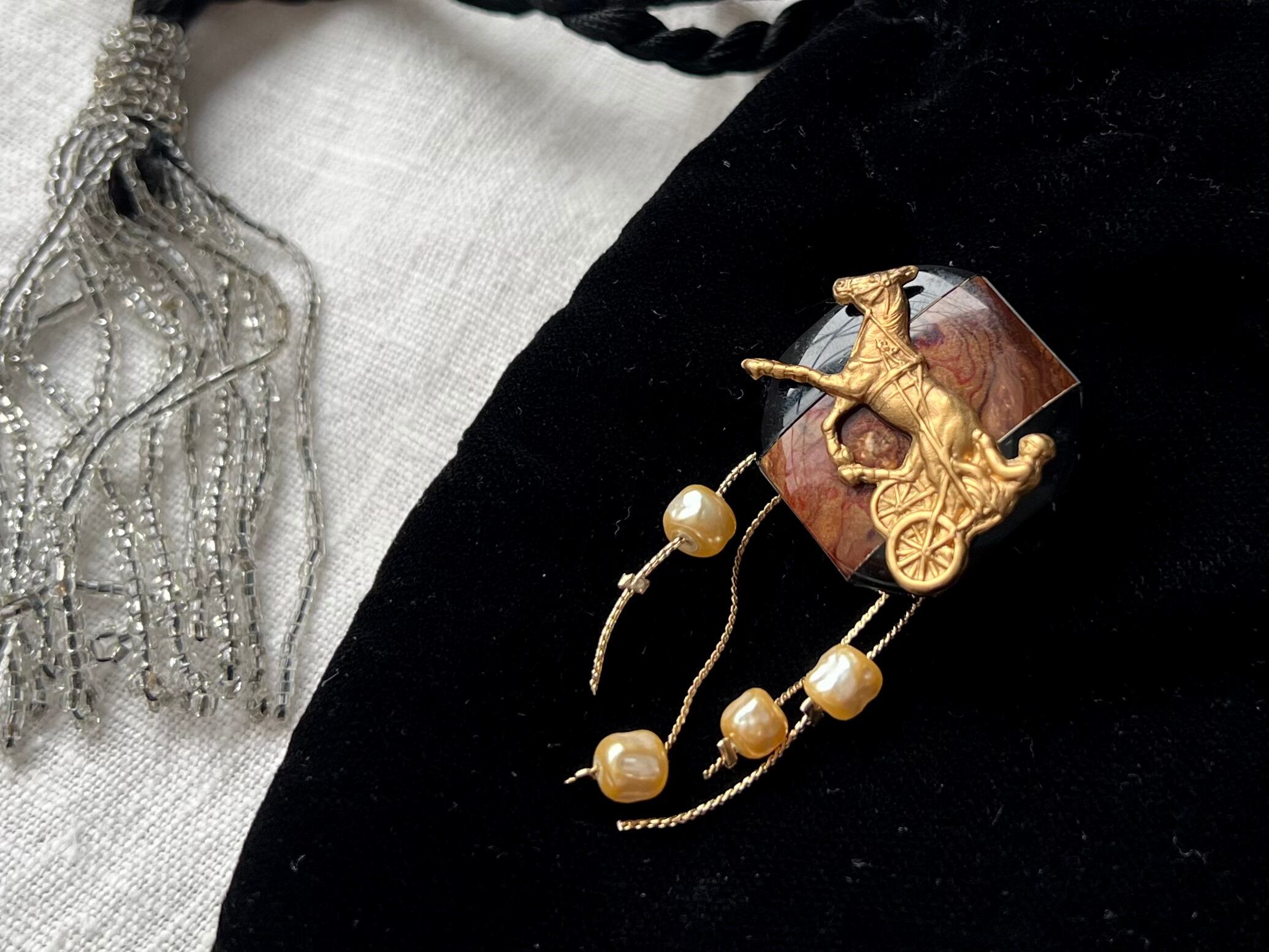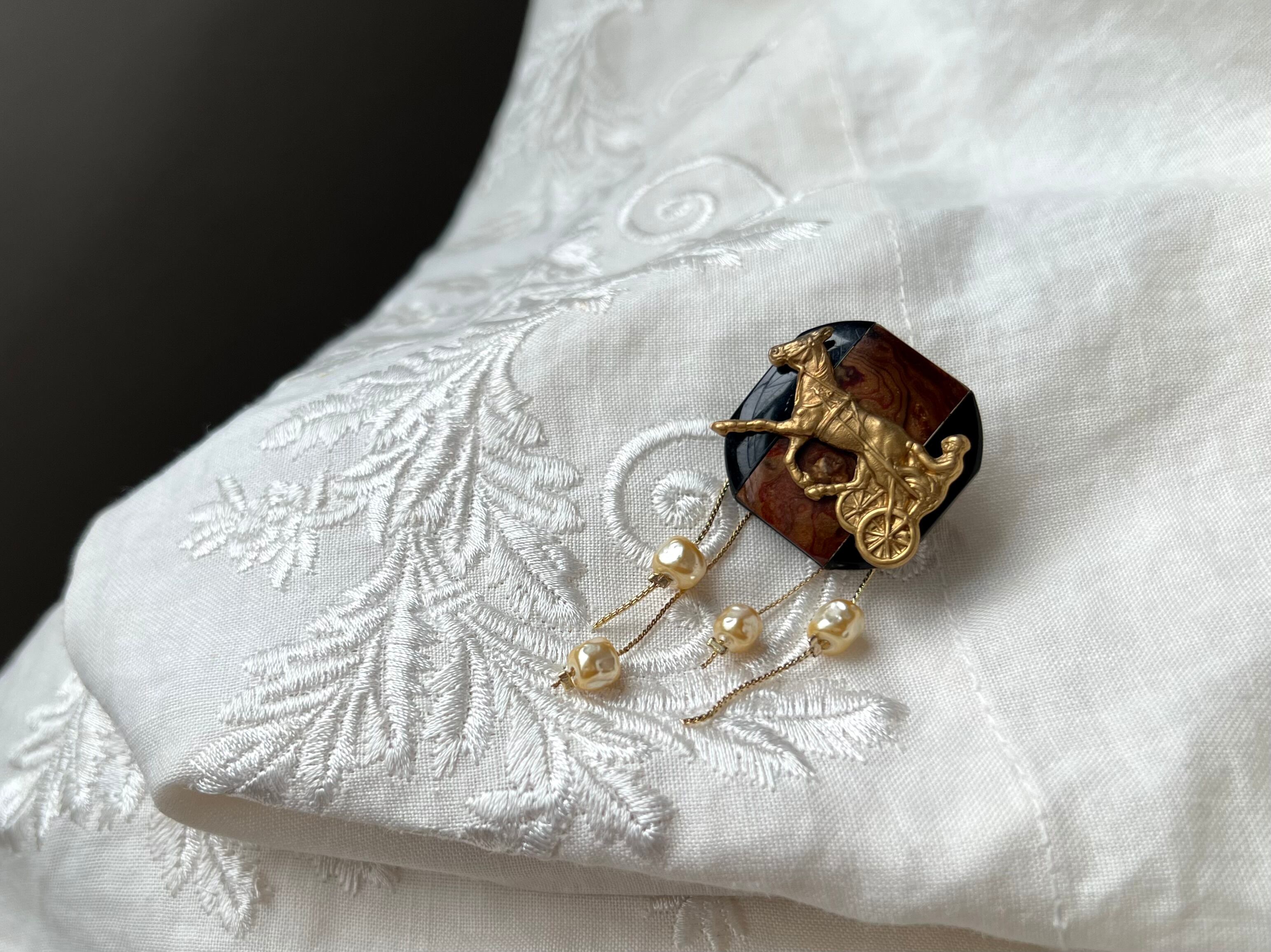 木目調のヴィンテージボタンに馬車のチャームを置き、小粒のガラスパールを散らしています。