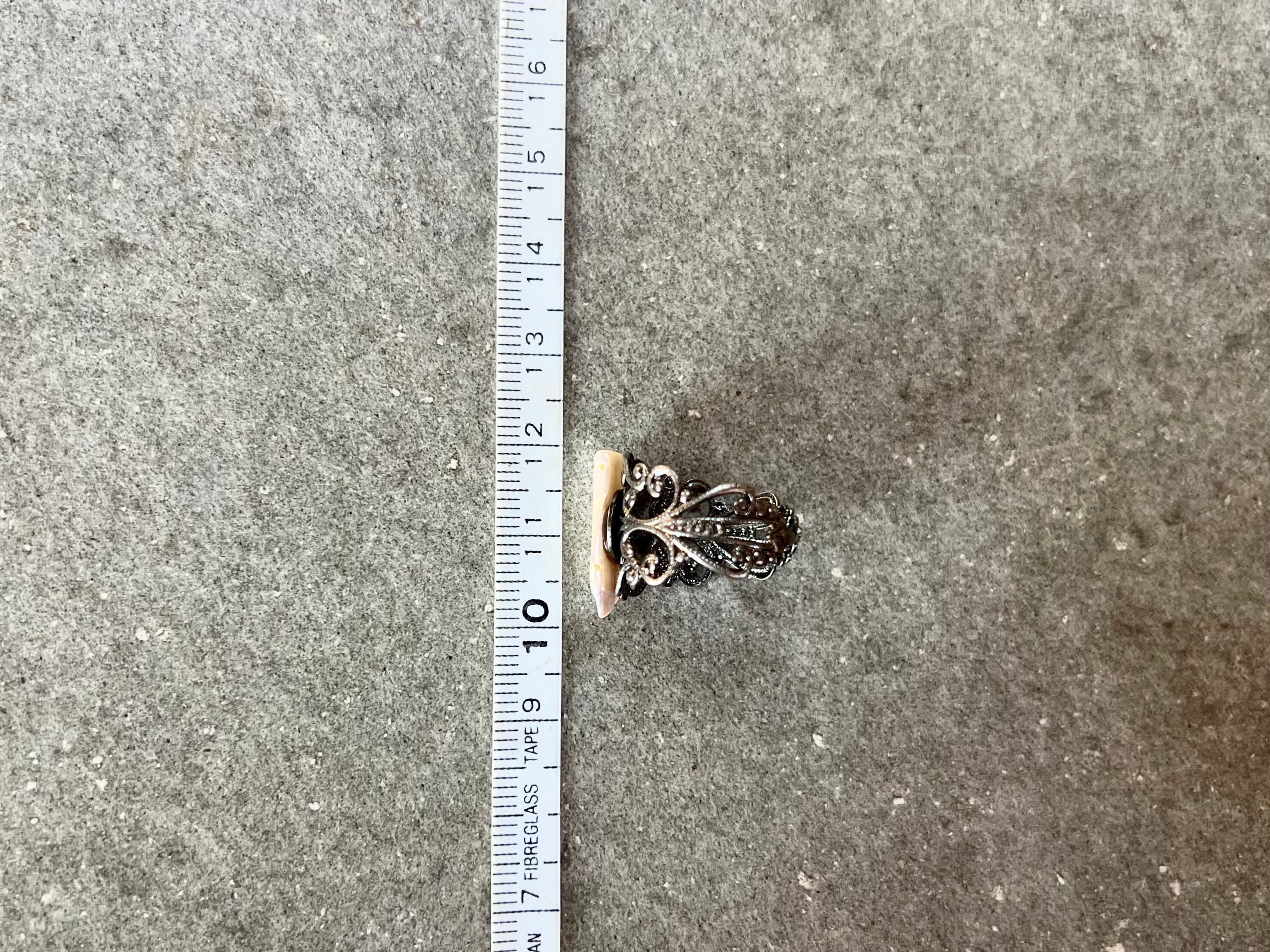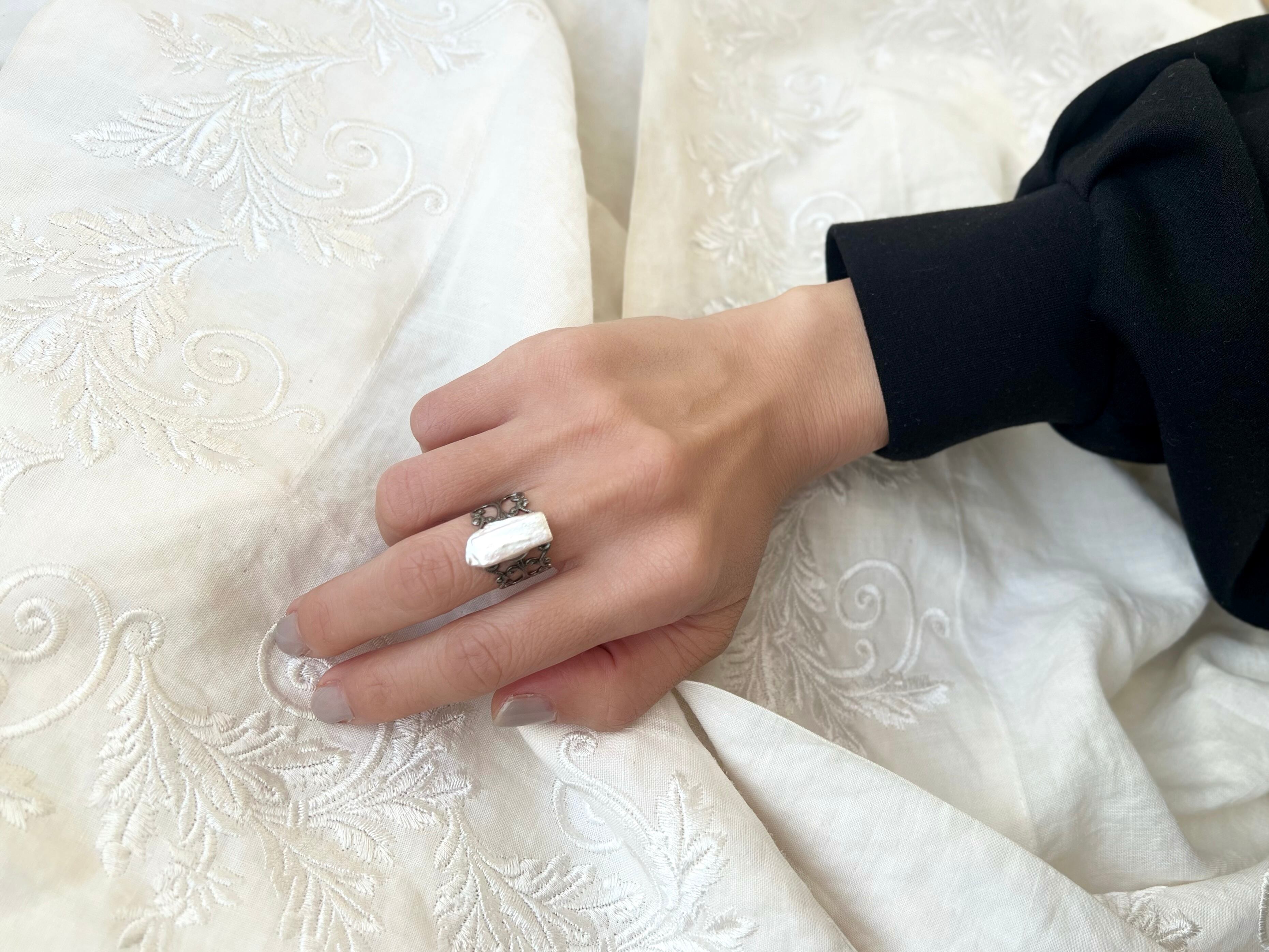 クラシカルなリング台に淡水パールを乗せたシンプルなリングですが、デザイン性の高さとボリューム感で、装いの良いアクセントになります。