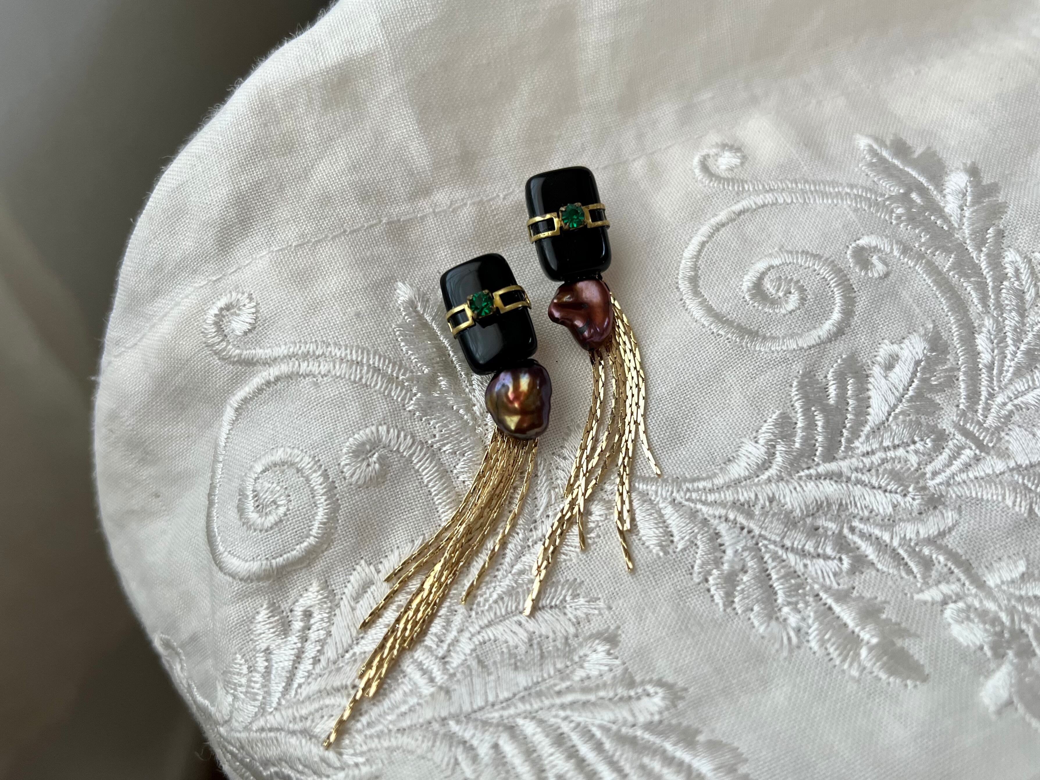 グリーンのスワロフスキーを置いたブラックガラスをカボションに、淡水パールを合わせています。