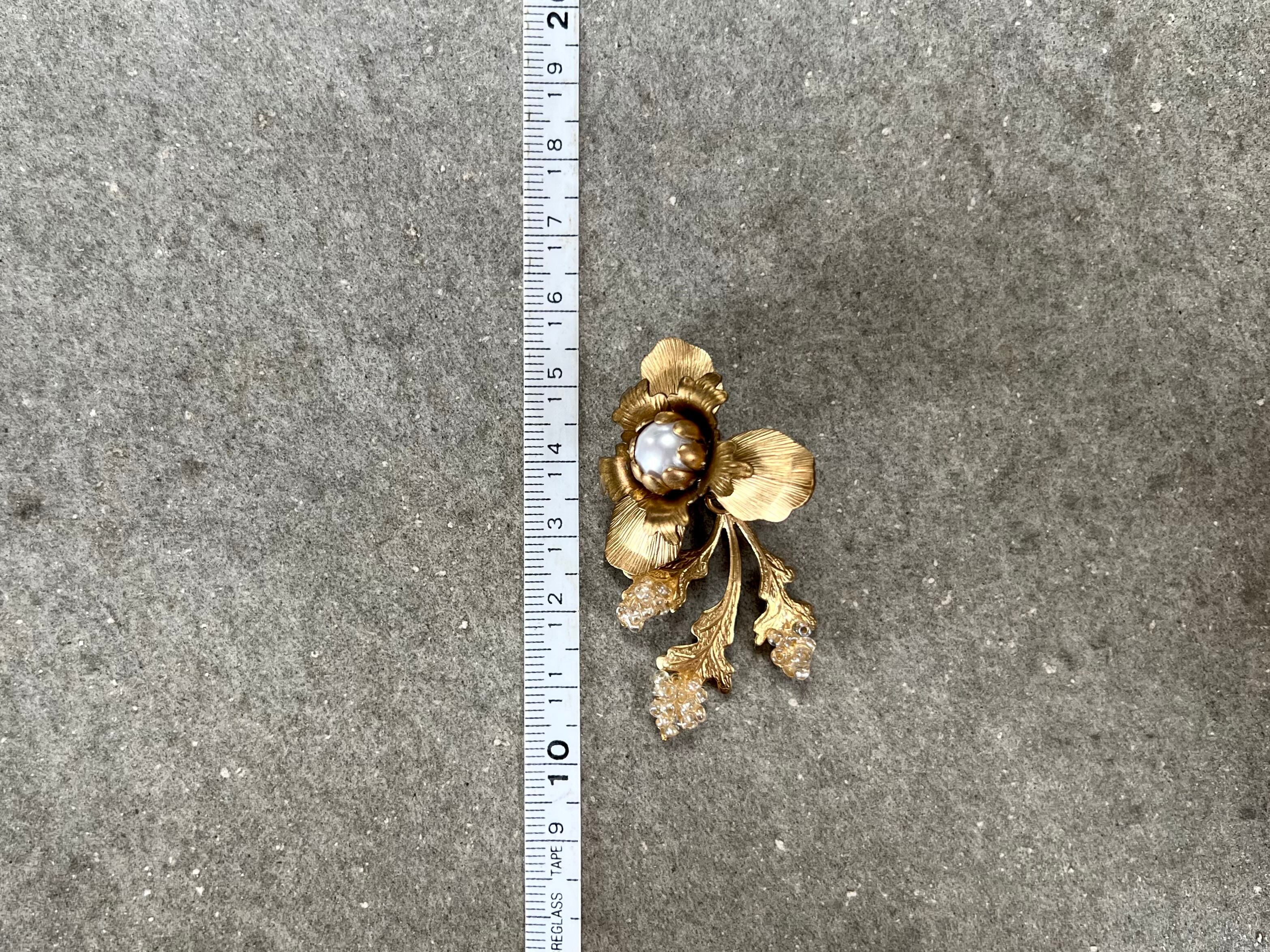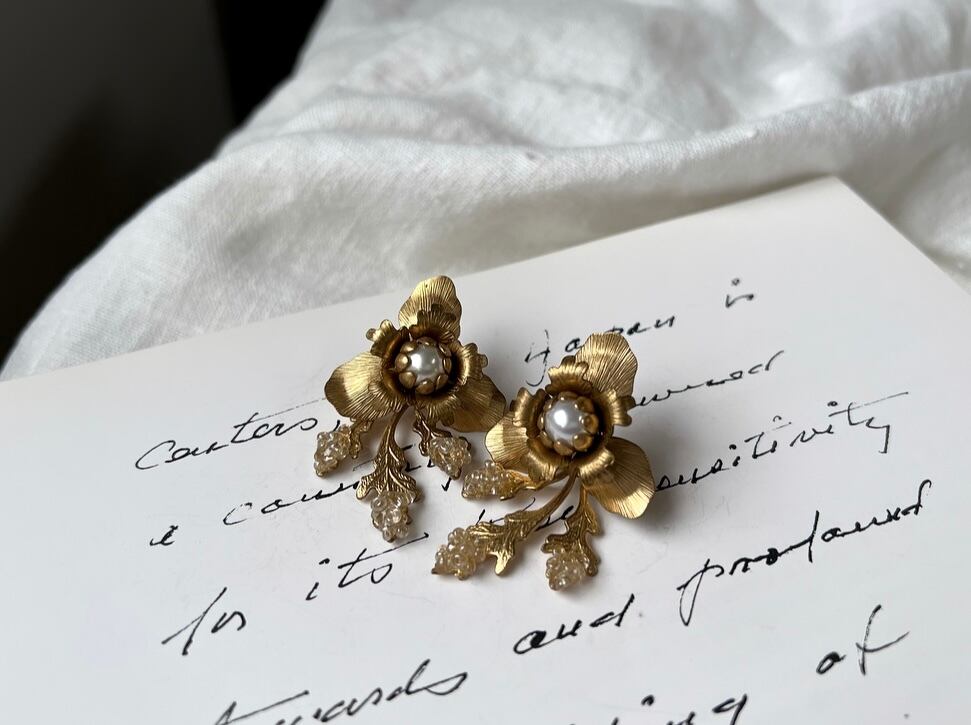 フラワーパーツを重ねて中央にガラスパールを含んだカボションに、シードビーズを添えたリーフを添えた、華やかなデザインです。