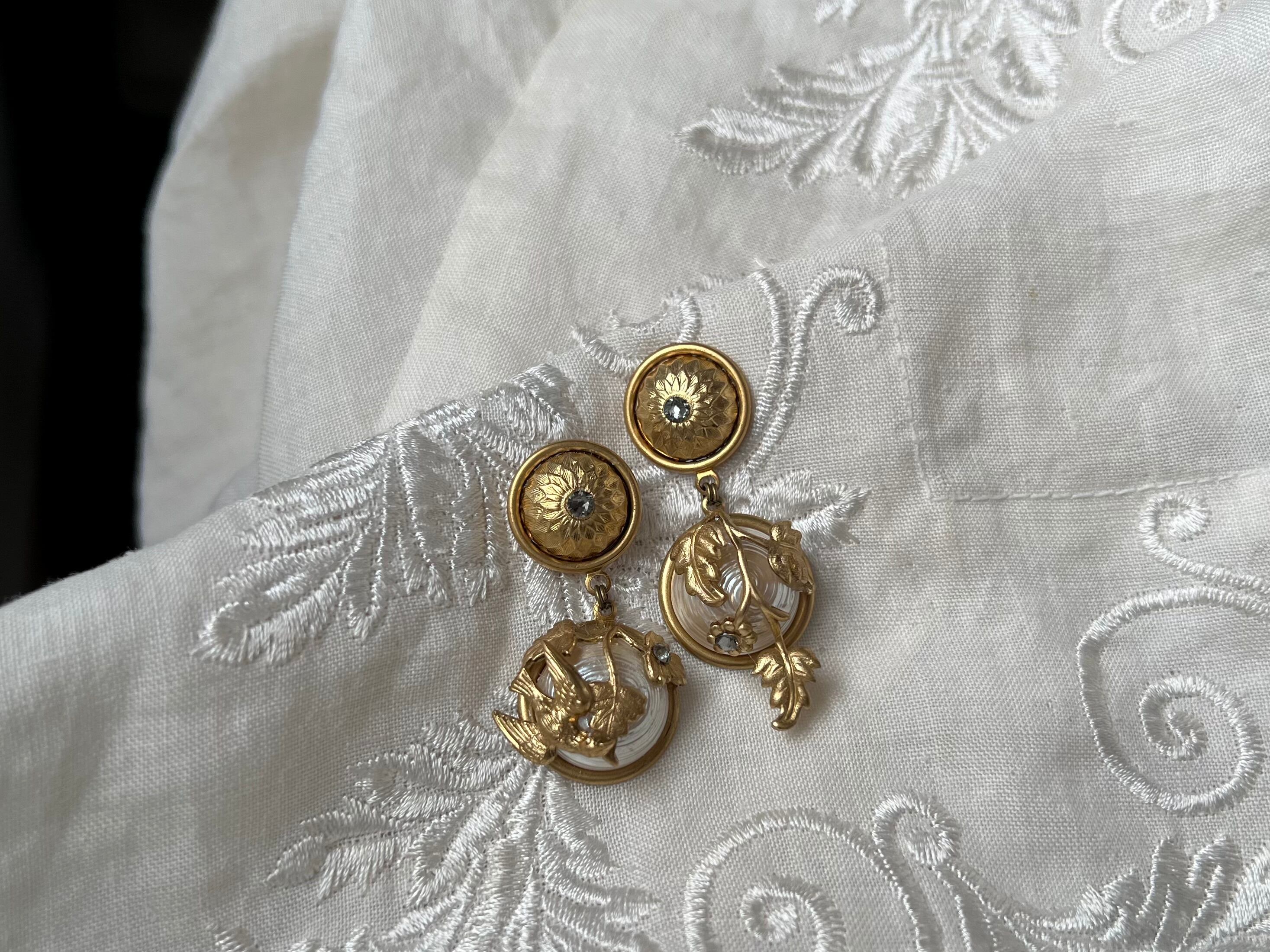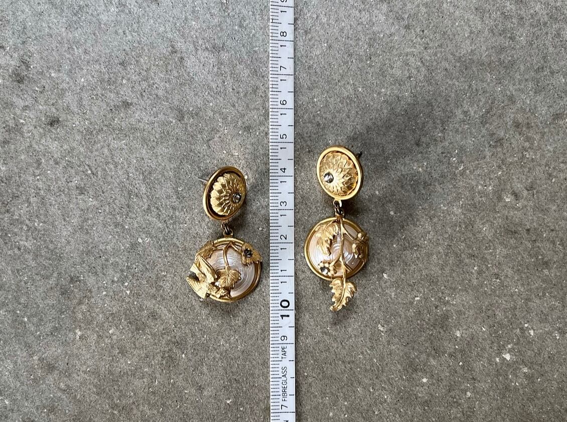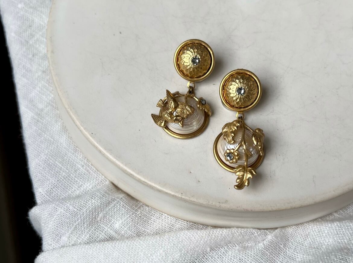 ヴィンテージパーツを使用してアシンメトリーなピアスを作りました。