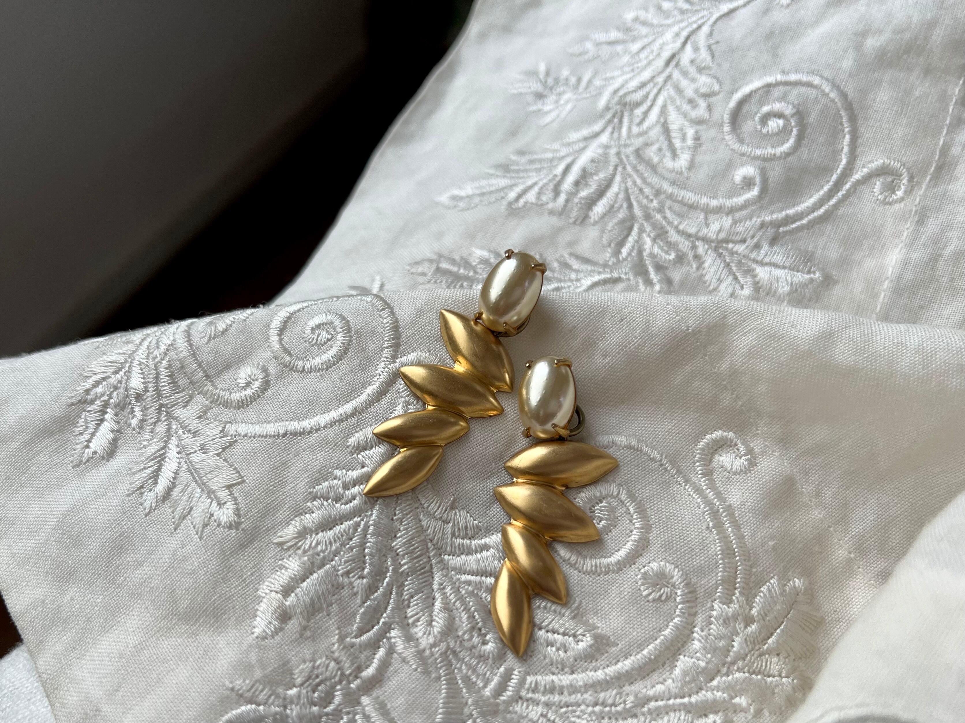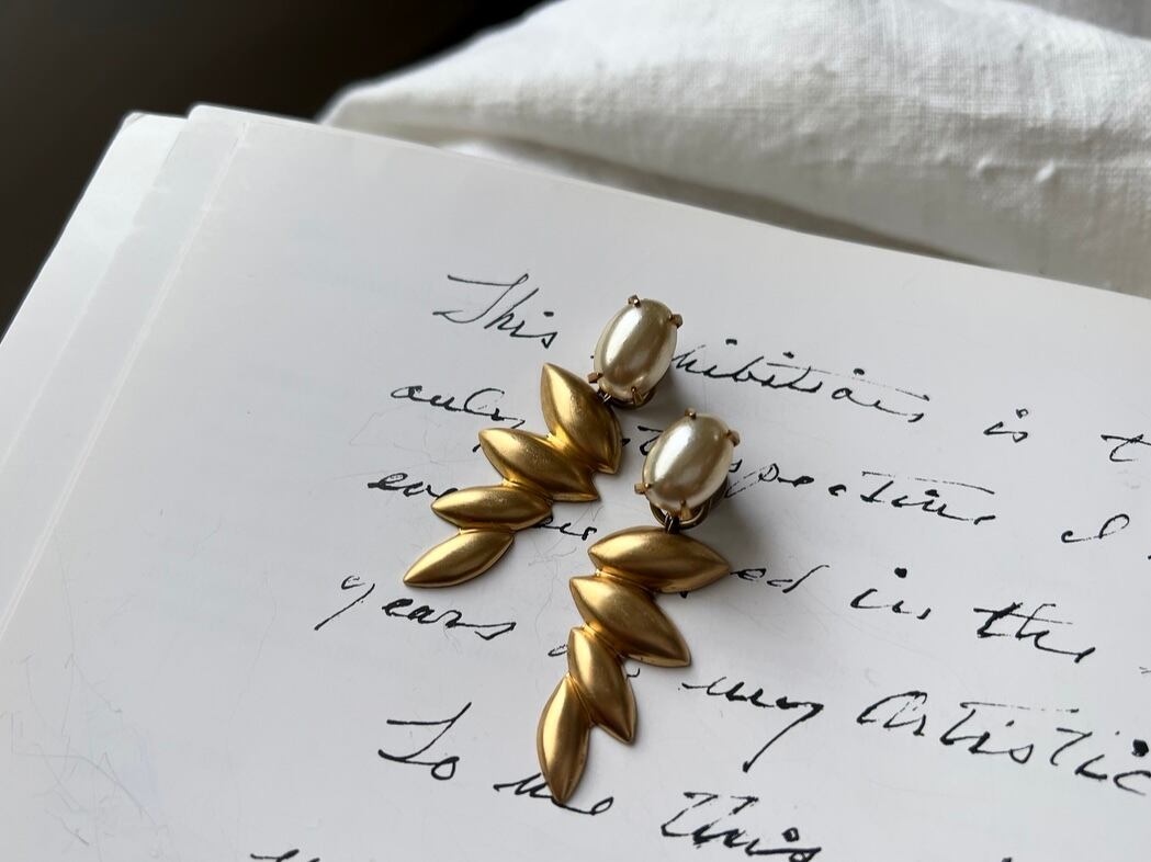 ガラスパールをカボションに真鍮パーツを合わせています。