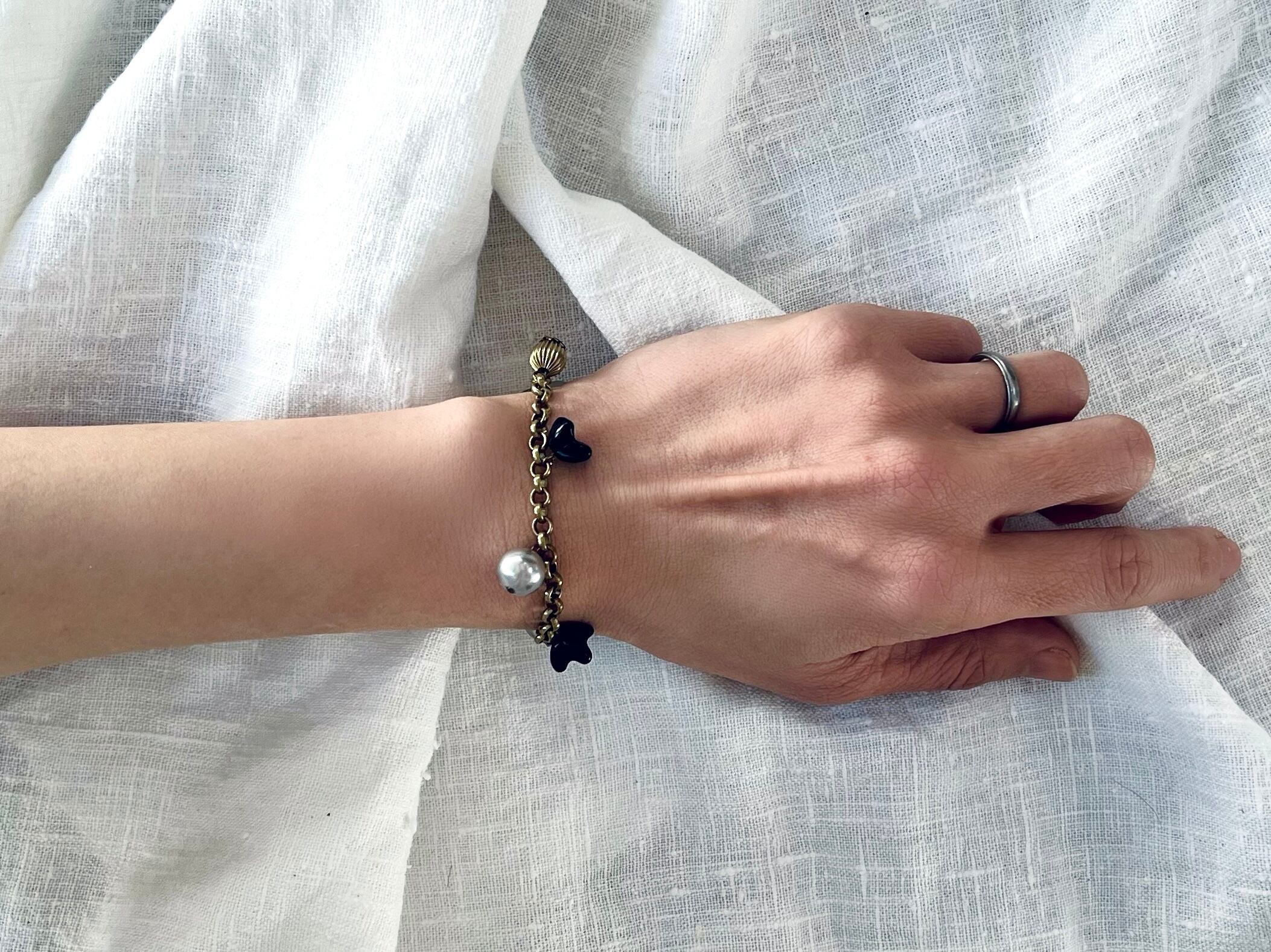 シンプルかつ程よいボリュームのあるチェーンにシルバーグレーのガラスパールやブラックガラスフラワービーズ、ブラスボールを散らしています。