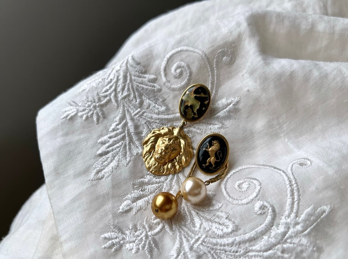 ライオンの強さに負けないガラスパールやチェーン、マーブルパーツを合わせていて、存在感は抜群ですが飽くまでも上品な印象で、デイリーからお呼ばれまで幅広くお使い頂ける一品です。