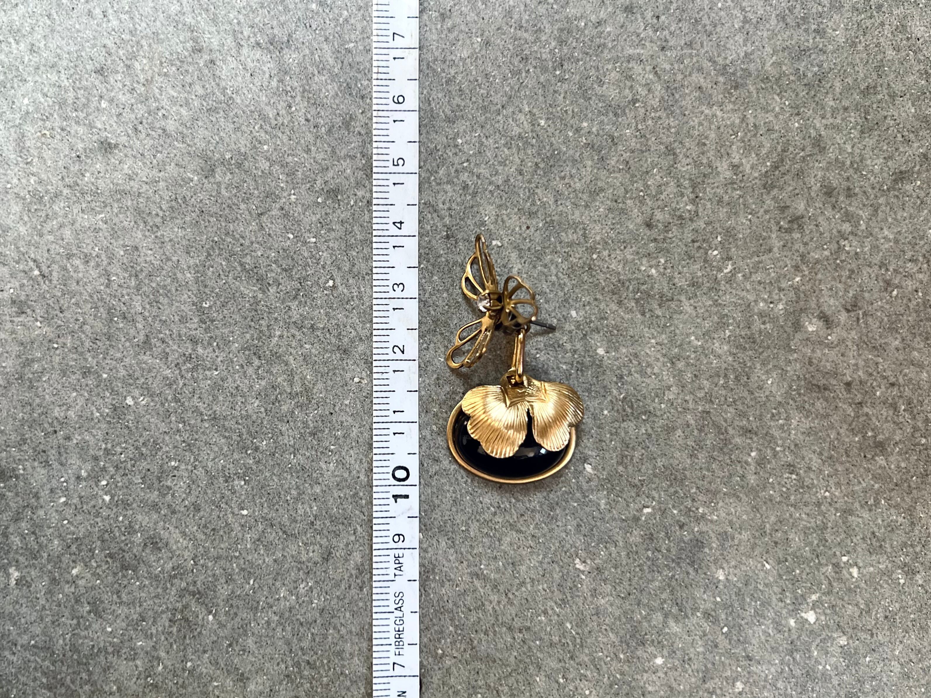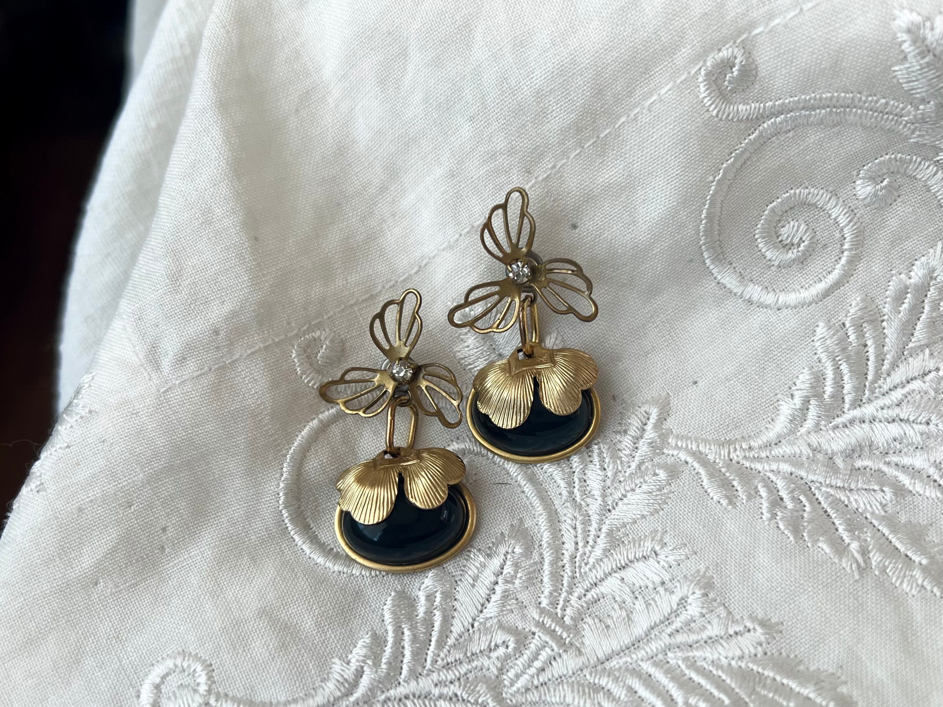 スワロフスキーを置いた透かしのフラワーをカボションに花弁のチャームとブラックドームを添えた、ロマンチックなデザインです。
