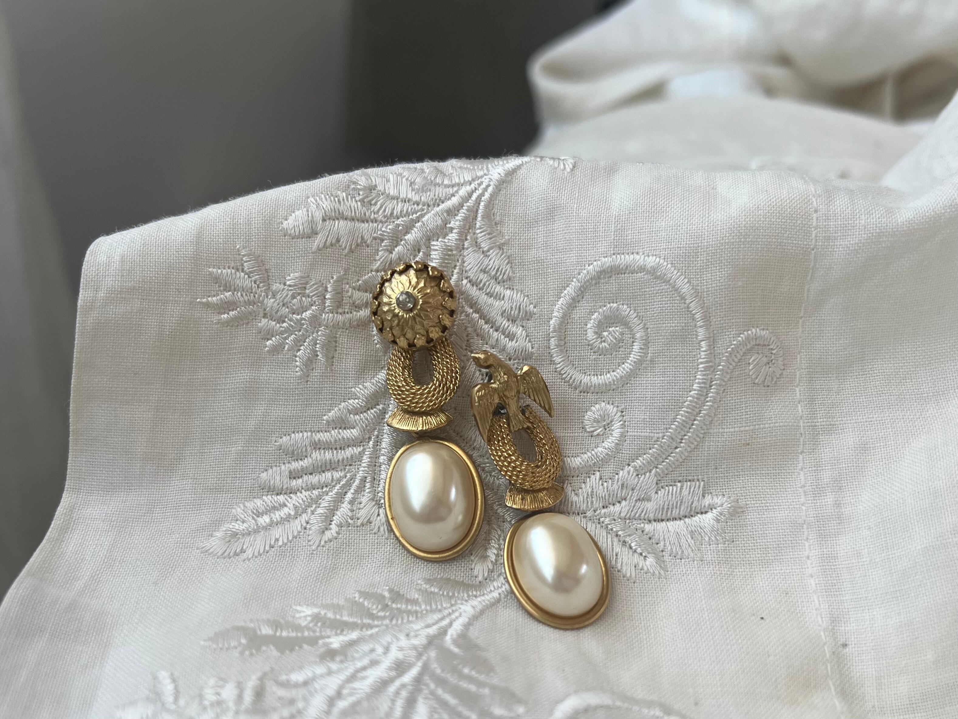 ヴィンテージパーツを使用してアシンメトリーなピアスを作りました。